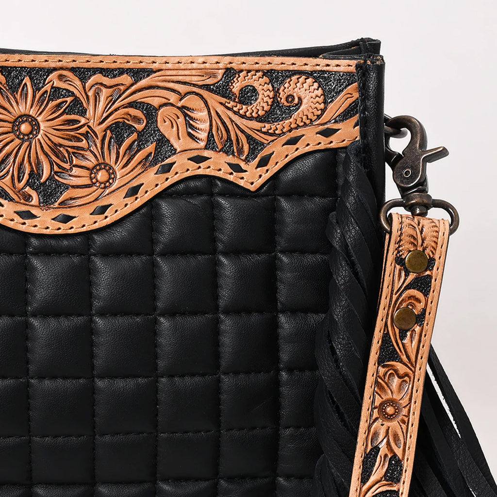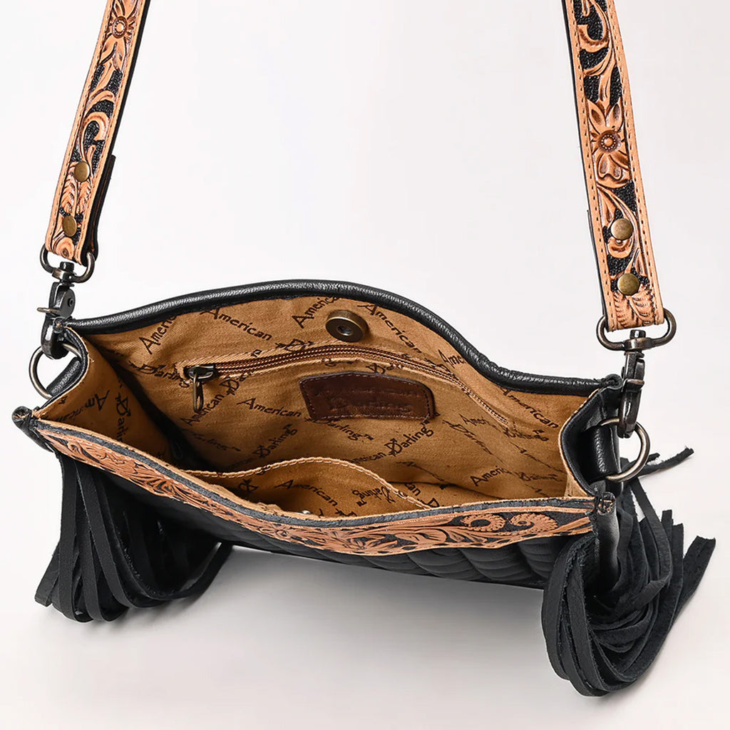 The American Darling Black Puff Tooled Purse showcases exquisite craftsmanship with its detailed tooling and rich black leather. Designed for the discerning individual, this purse offers a sophisticated look while providing ample space for your essentials. A timeless accessory that effortlessly enhances any outfit.