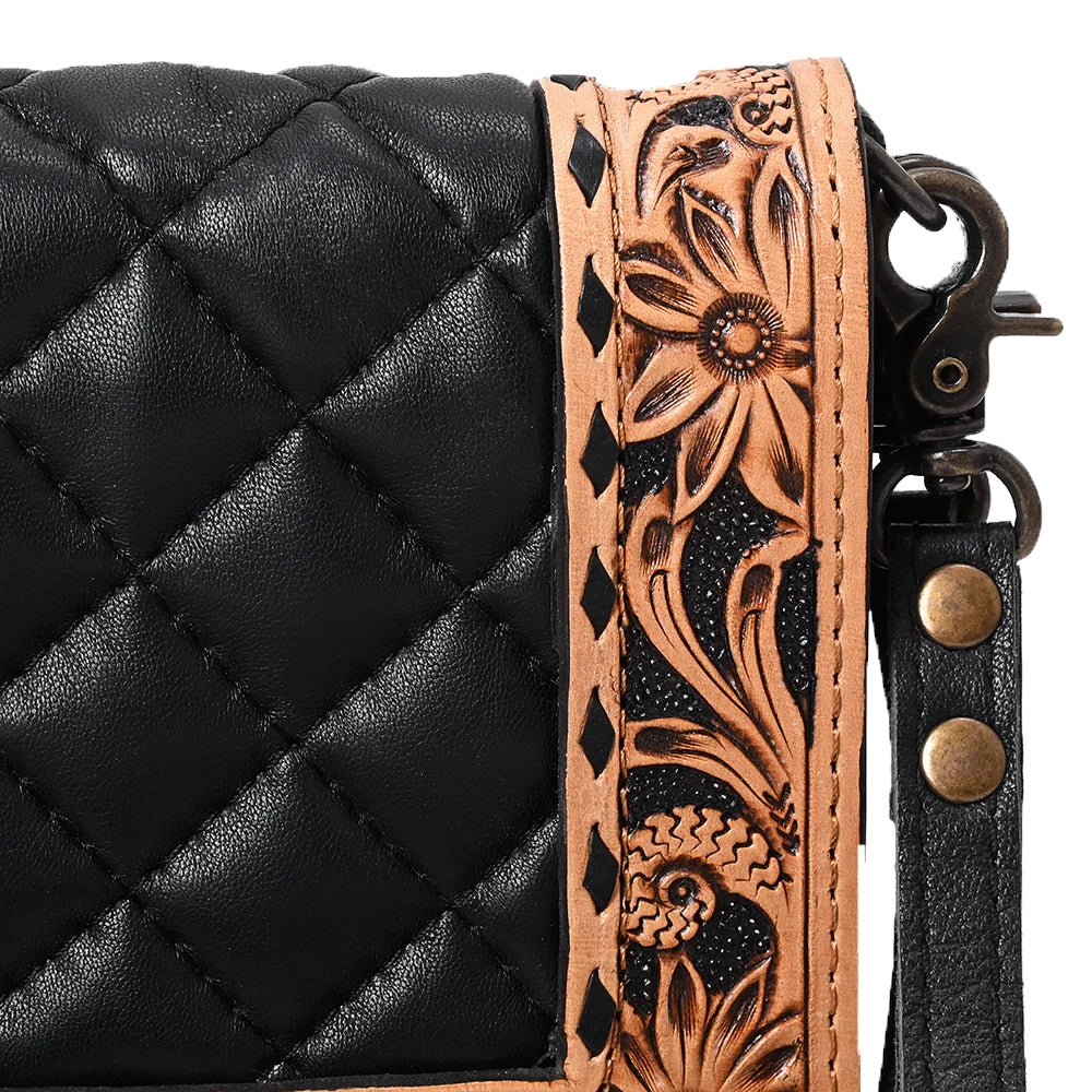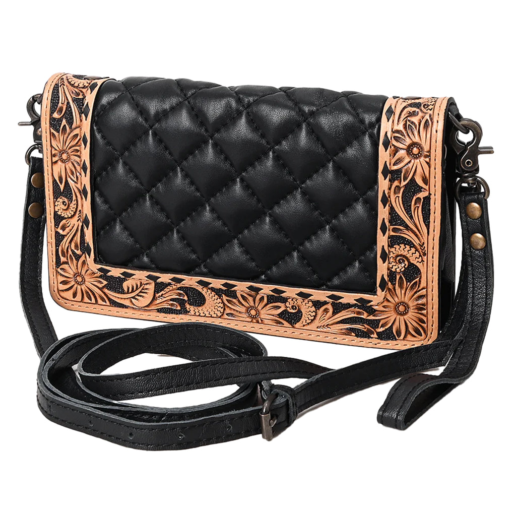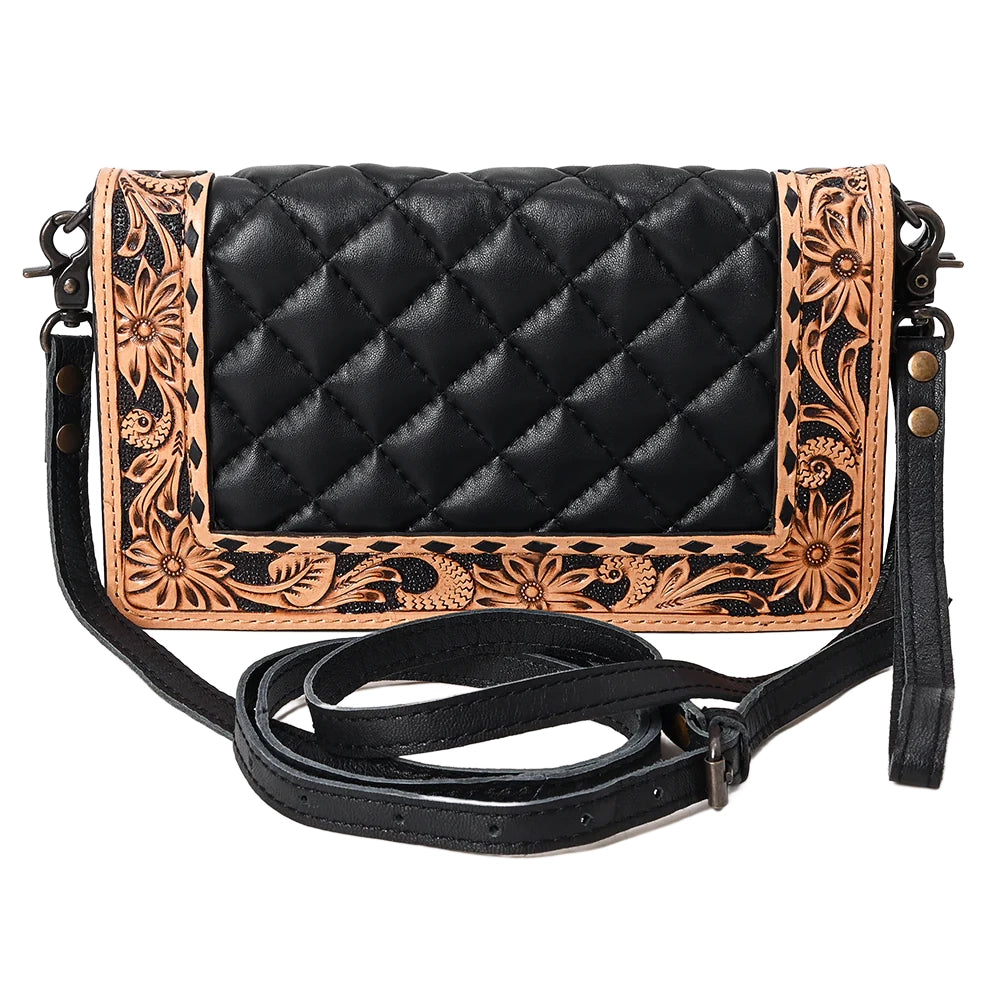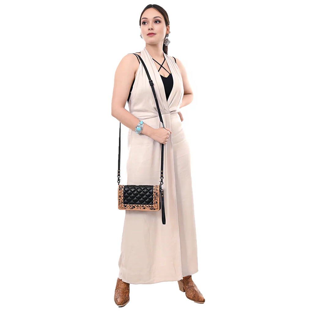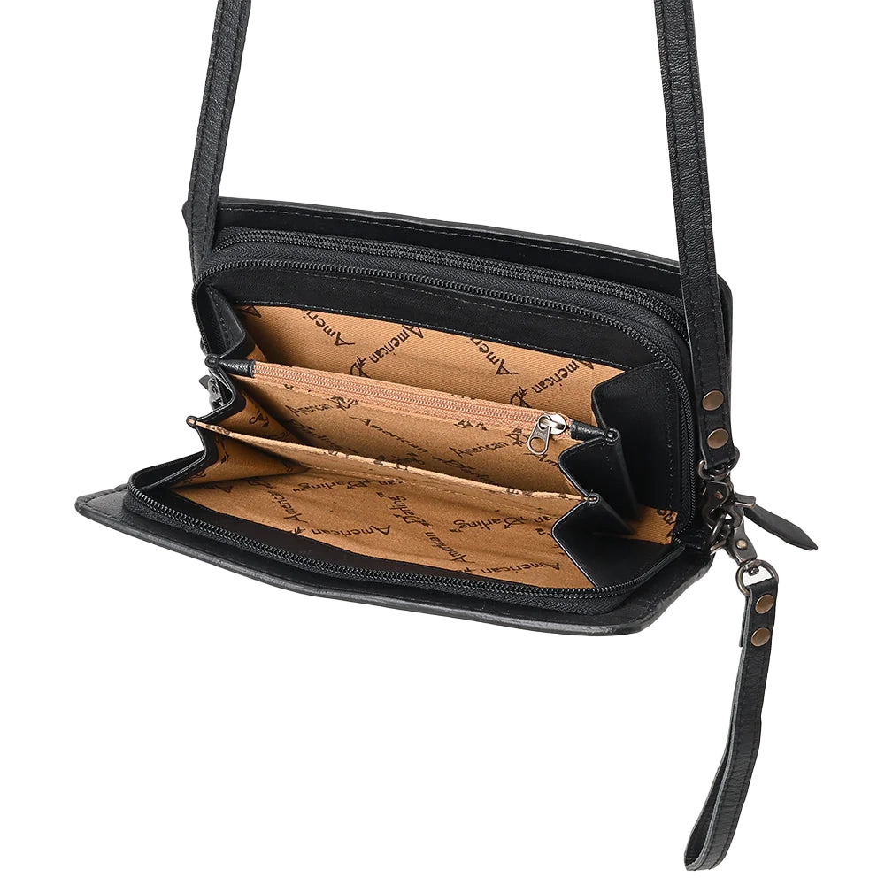 Experience the timeless elegance of the American Darling Tooled Border Wallet Crossbody, crafted from supple leather that softens and develops character over time. It features an adjustable genuine leather shoulder strap for a perfect fit and sturdy antique-finished metal hardware for lasting durability. Equipped with a reliable YKK zipper, your valuables stay secure wherever you go. Compact yet spacious, making it an ideal companion for everyday use.