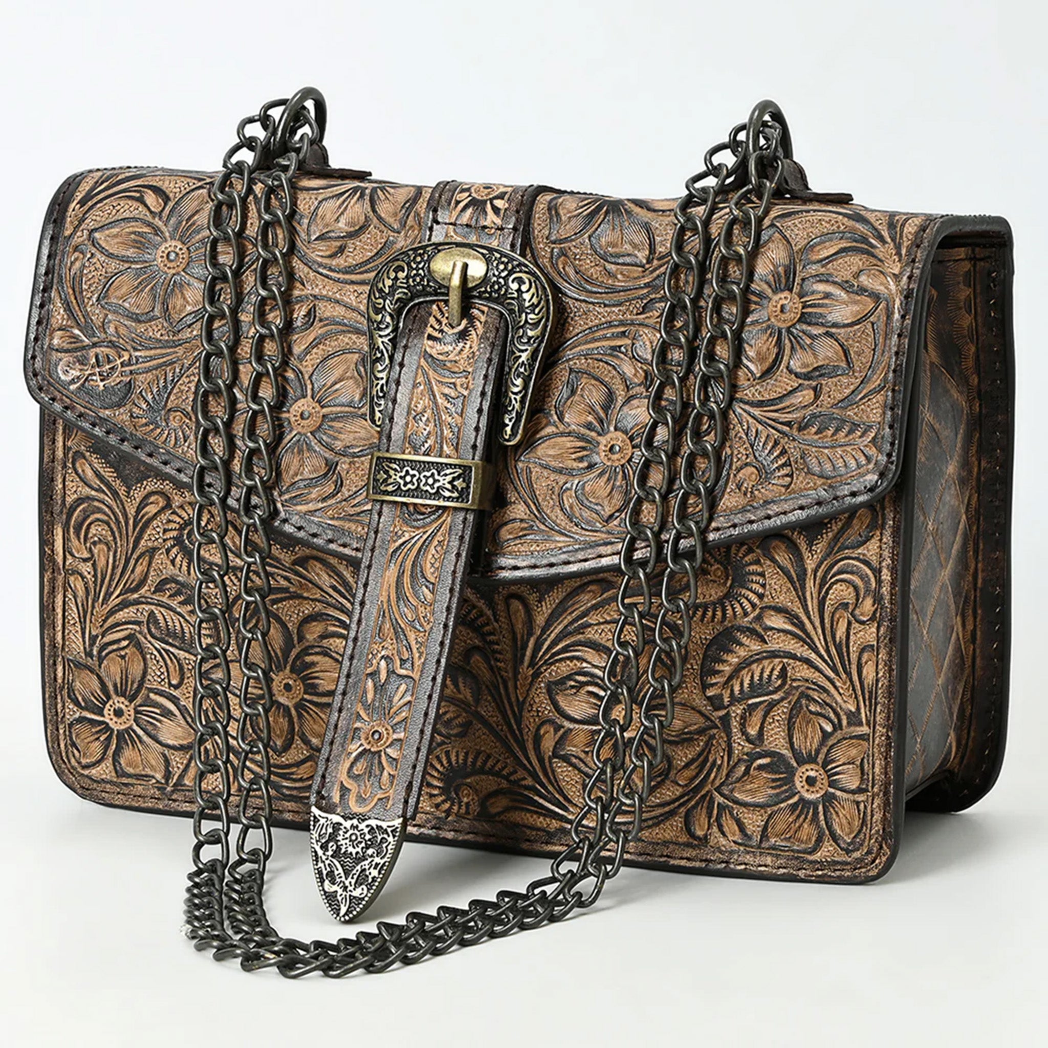 Crafted in rich chocolate leather with gorgeous floral tooling that'll turn heads, this beauty combines Western charm with everyday practicality. The compact square shape fits perfectly in your hands or slung across your body, while the intricate hand-tooled details prove you've got impeccable taste.