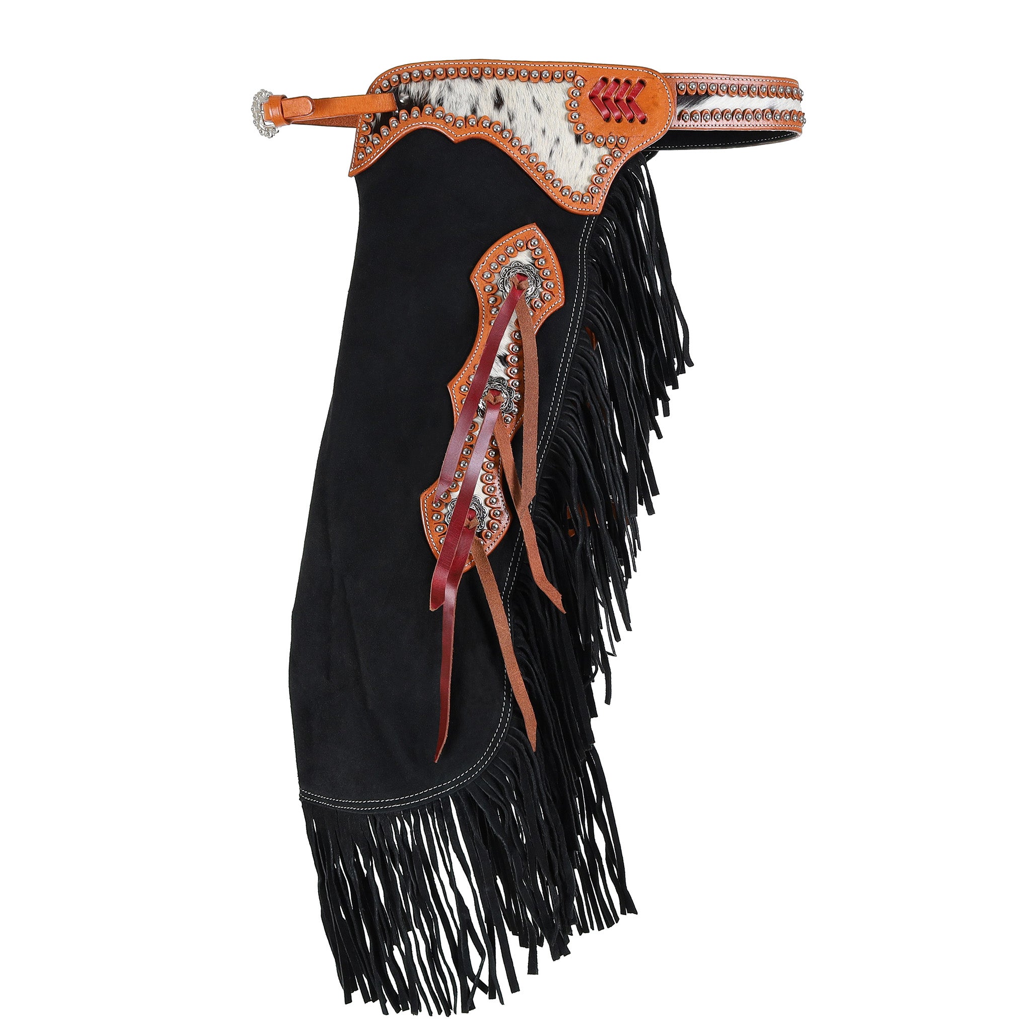 - Slotted antique floral conchos with dark leather tassels.