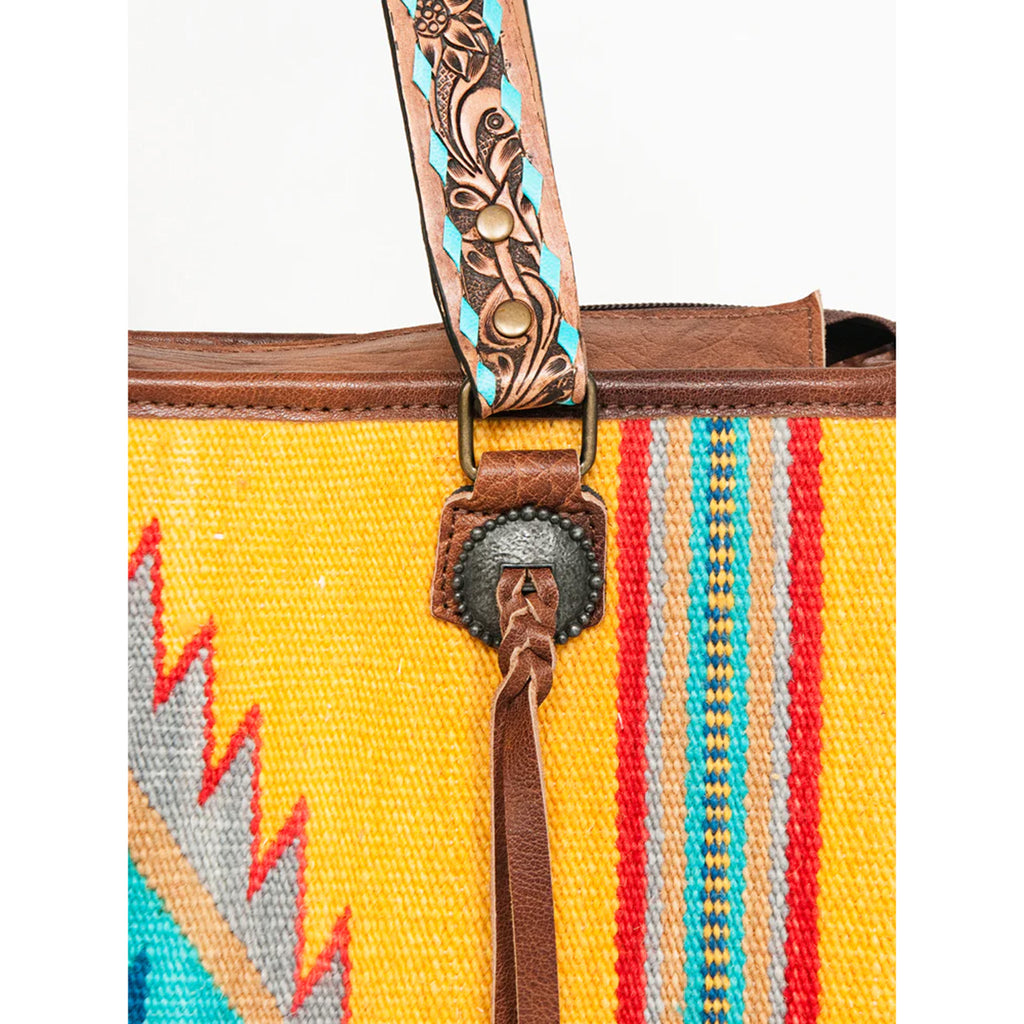 Make a bold statement with the American Darling Yellow Saddle Blanket Tote Bag. Crafted from vibrant yellow saddle blanket material, this tote combines rugged durability with eye-catching style. Perfect for those who dare to stand out, it offers ample space for your essentials while adding a fearless pop of color to any outfit. Embrace adventure and carry your belongings with confidence.