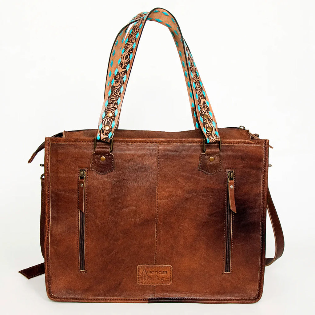 - Hand-tooled leather shoulder straps with floral & turquoise inlay