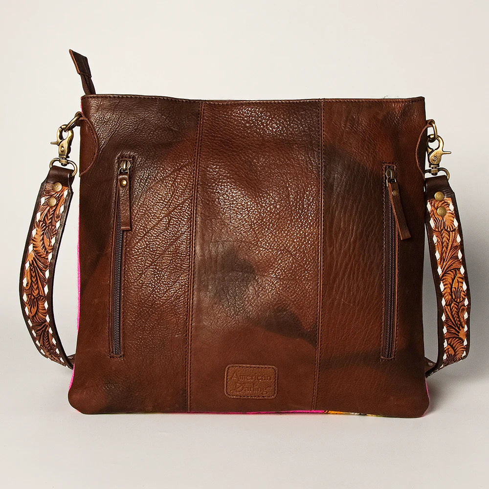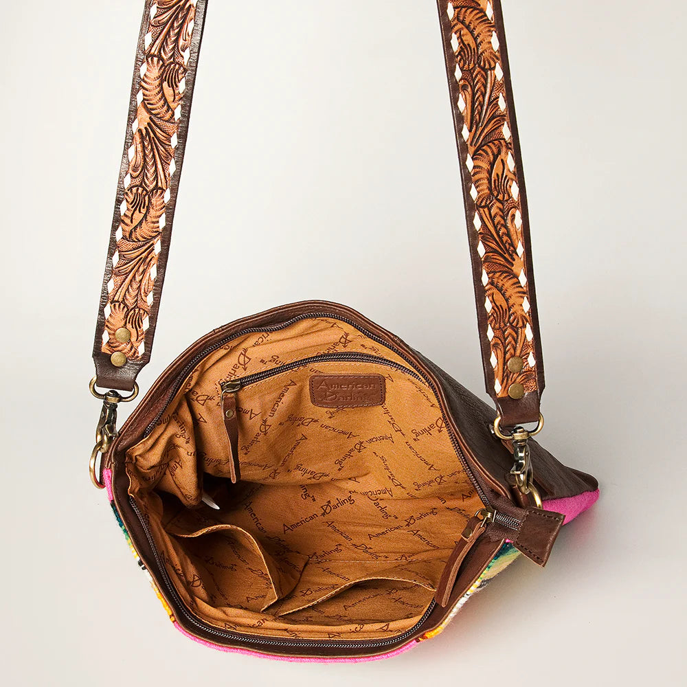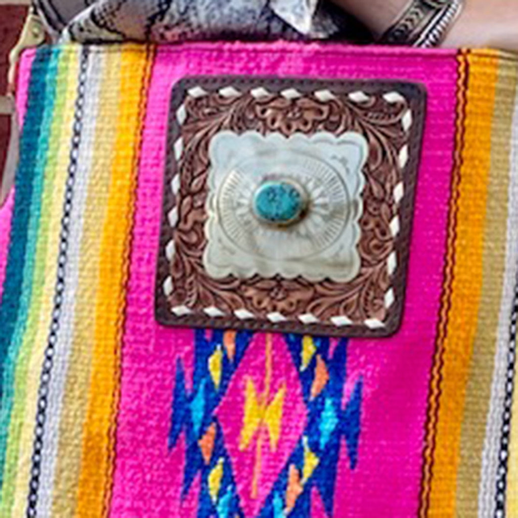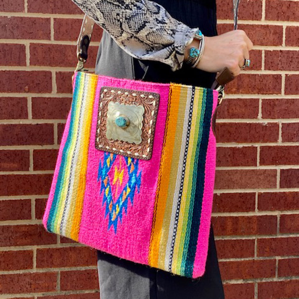 What a fun purse for summer! This fun and fresh pink serape saddle blanket crossbody from American Darling is sure to make a statement + carry everything you need! Featuring buckstitched tooling with a silver/turquoise conch detail, you are sure to add a little Western Flare to any outfit when carrying this bag!