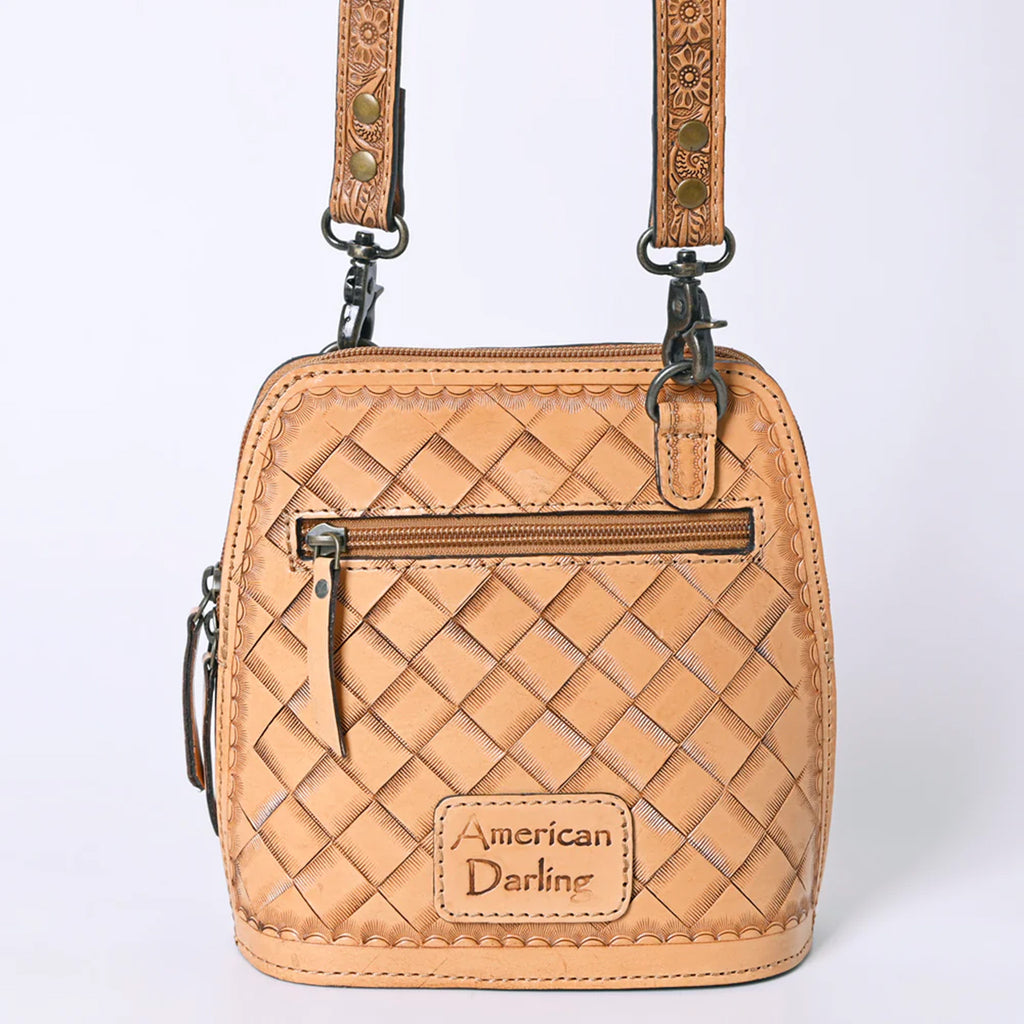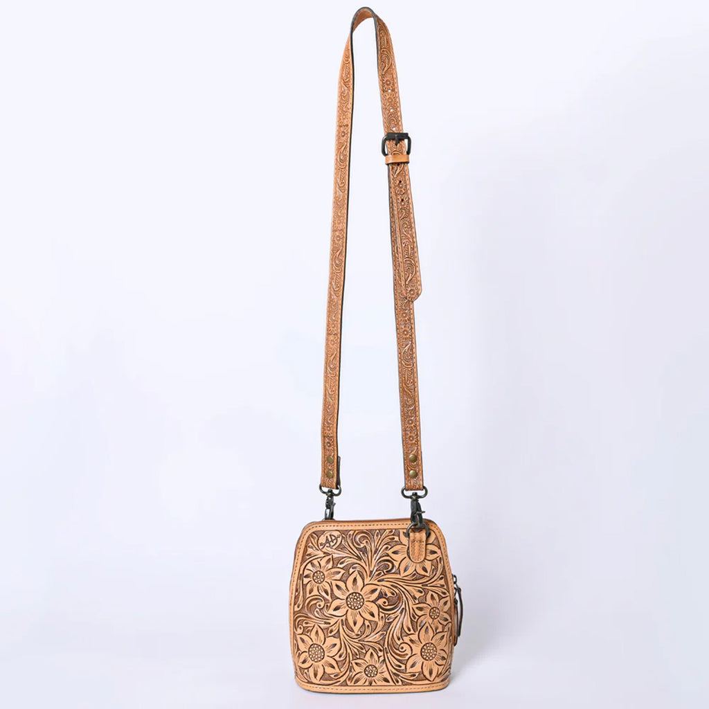 The American Darling Tan Tooled Crossbody combines timeless Western style with practical design. Made from premium tan leather featuring detailed tooling, this crossbody bag offers both durability and distinctive charm. Its adjustable strap provides comfortable, hands-free convenience, perfect for daily use or special events. Carry your essentials with confidence and add a touch of classic elegance to any outfit.