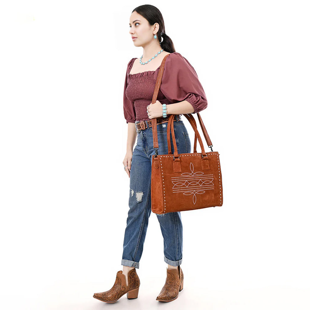 The American Darling Tan Boot Stitch Tote Bag combines classic style with practical design. Crafted with durable tan leather and detailed boot stitch accents, this tote offers both strength and timeless appeal. Its spacious interior makes it perfect for carrying daily essentials, while the sturdy handles ensure comfortable use throughout your day. Ideal for those who appreciate quality and functionality in one stylish package.