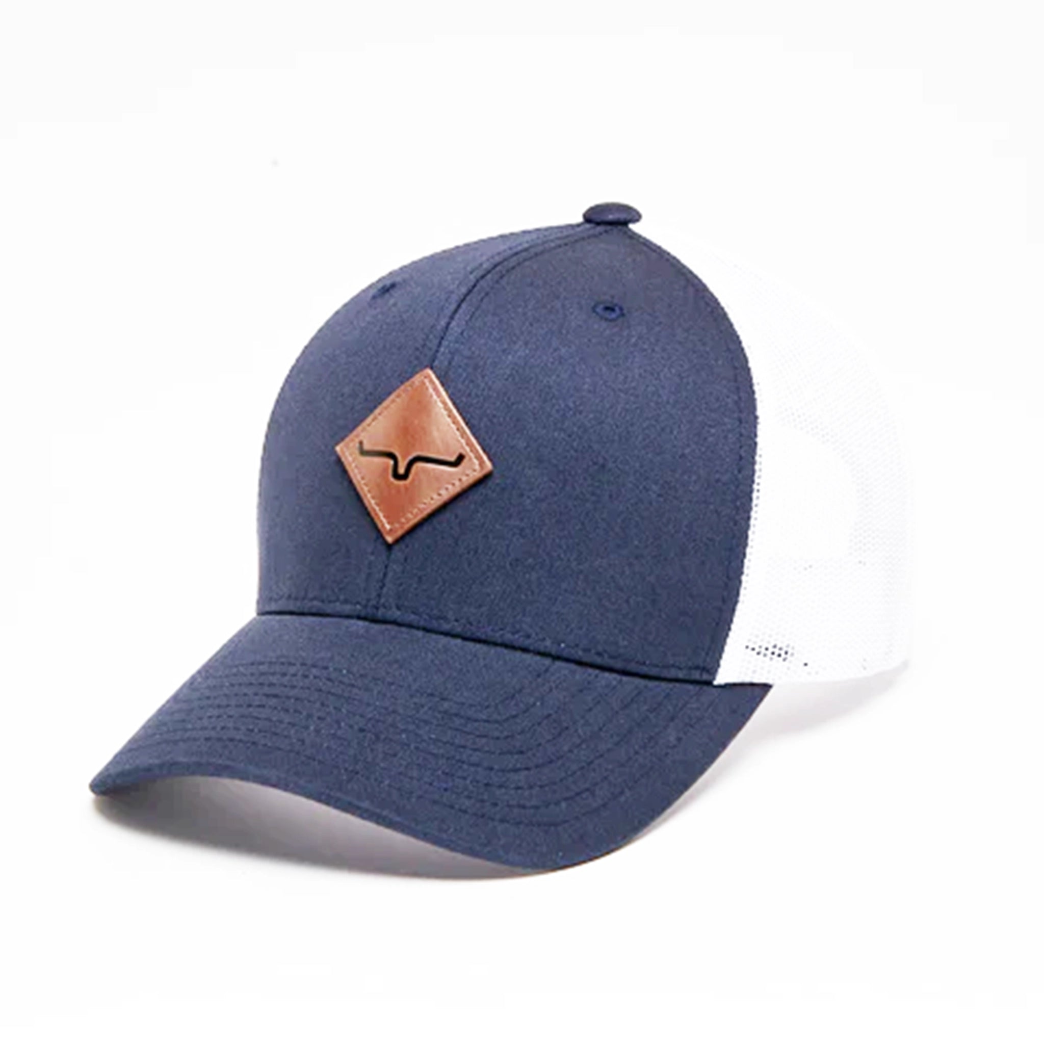 Kimes Ranch offers this mid-profile cap with a curved brim and adjustable backstrap. Made of a cotton twill front and poly mesh back, also has a real leather diamond patch front and center with the Kimes Ranch brand! Available in three colors: Black, Grey or Navy.