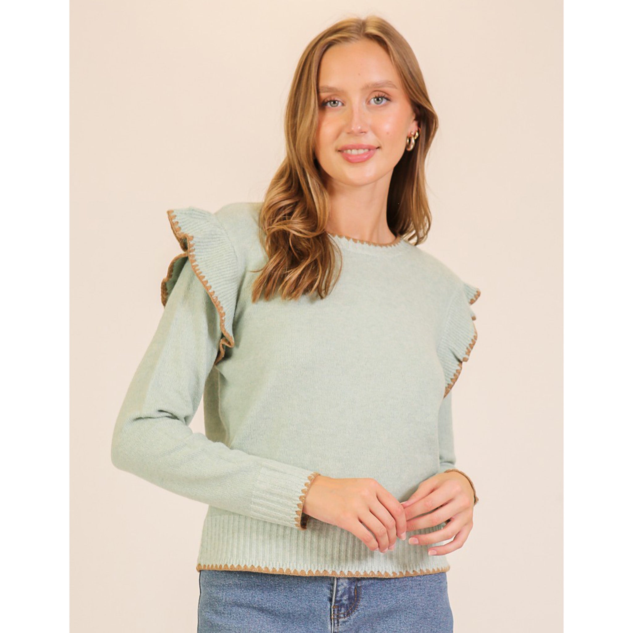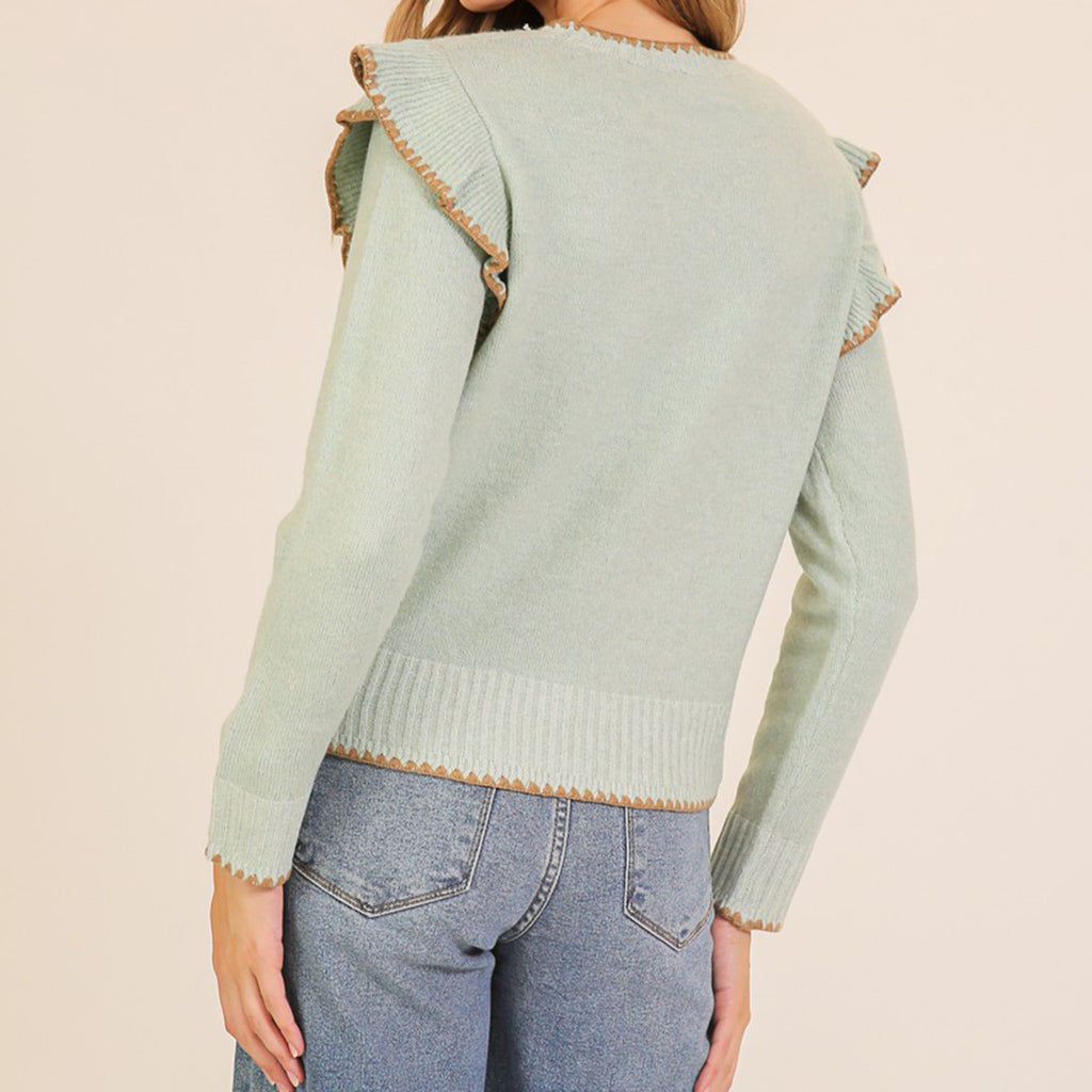 Elevate your cozy game with this charming jade sweater that's anything but basic. Delicate ruffles cascade from the shoulders, while rich brown trim adds a sophisticated pop of contrast. This playful piece brings texture and personality to any winter wardrobe—because who says comfort can't be fun?