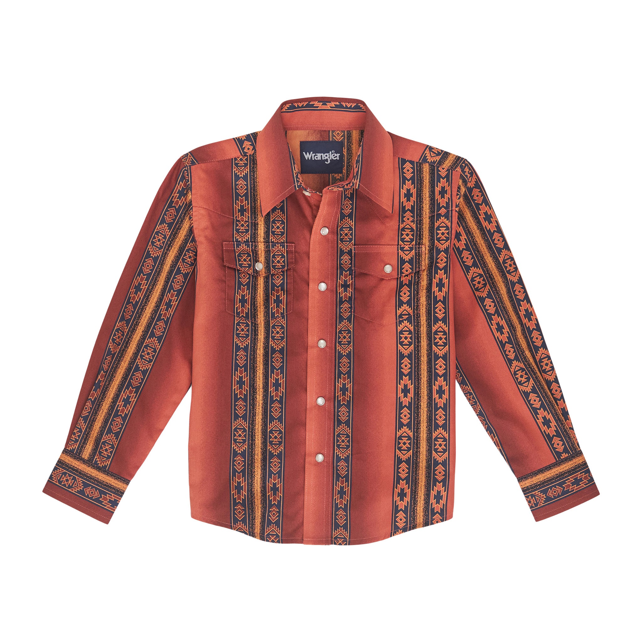 The Checotah Long Sleeve Shirt from Wrangler is a staple in the wardrobes of cowboys worldwide. This sophisticated men's shirt features a Navajo-inspired print, a classic fit, spread collar, pointed yokes, two snap flap pockets with a convenient pencil slot, adjustable cuffs, and a full-length snap closure for a touch of elegance. Made from premium cotton, it offers uncompromising comfort. Instantly elevate your look by pairing the Checotah shirt with Wrangler's top-of-the-line Retro® or Cowboy Cut® jeans.