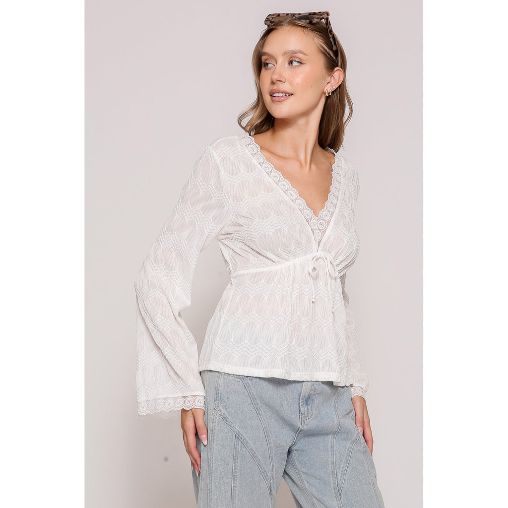 Elevate your everyday style with this charming off-white long sleeve shirt, where delicate textured lace trim adds just the right touch of sophistication. The soft, breathable fabric keeps you comfortable all day long, while the intricate lace detailing at the cuffs and neckline brings an effortless elegance to any outfit.