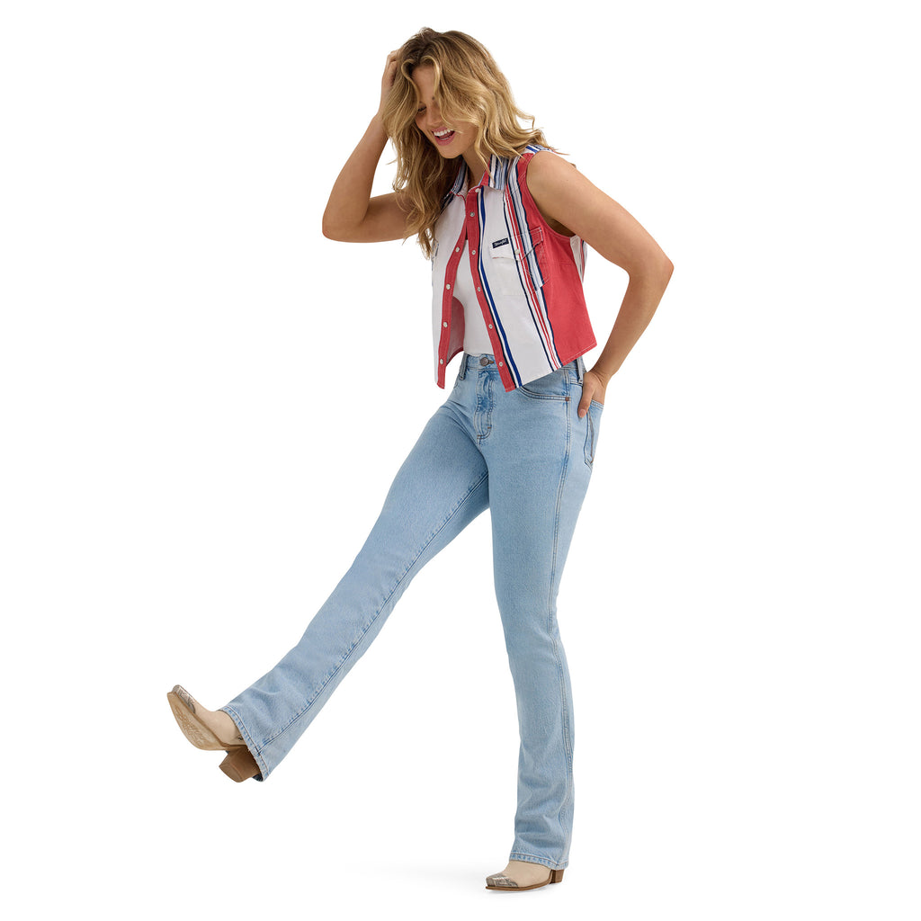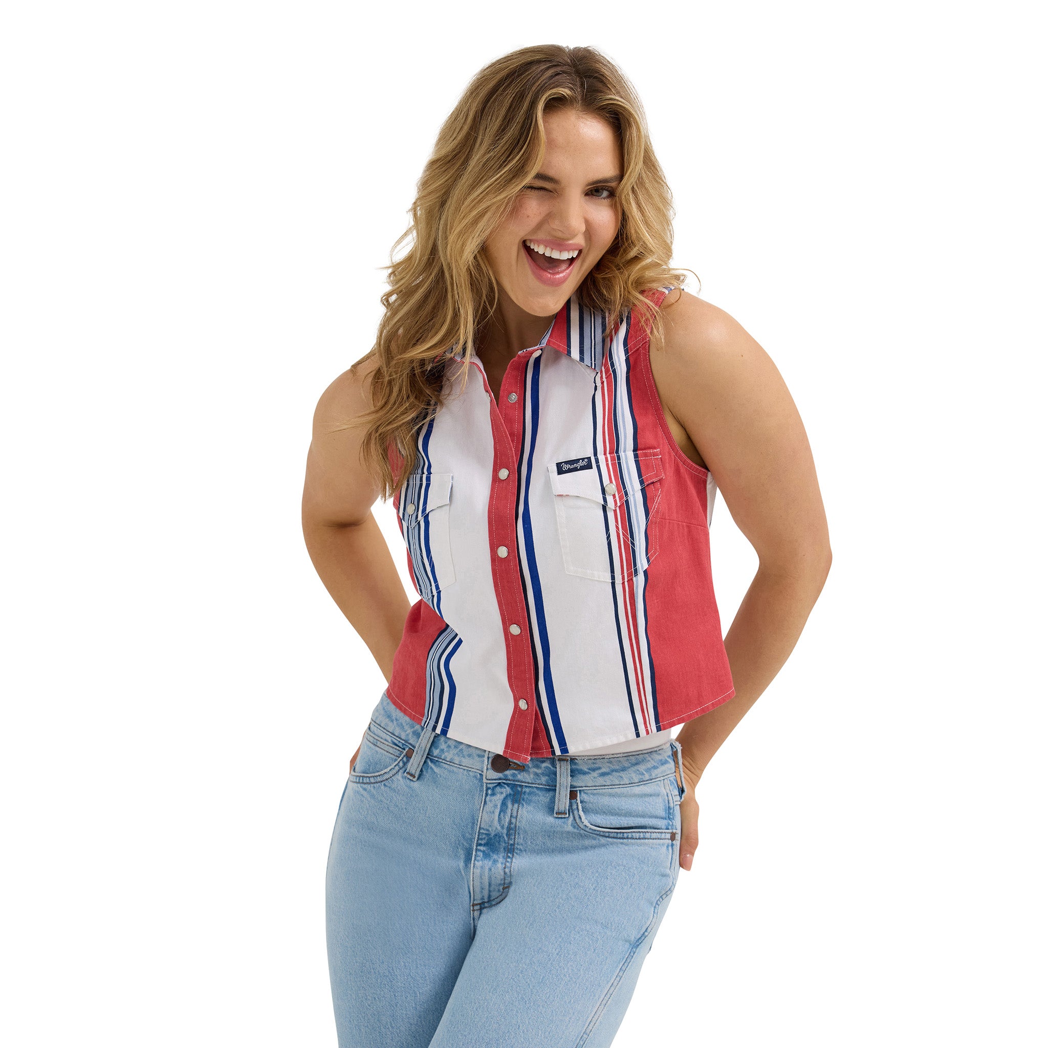 Who says cowboys get to have all the fun? The Women’s Wrangler Retro® Brushpopper Stripe Slim Crop Snap Tank mixes bold, vintage stripes with a sleeveless design that’s ideal for warm days. This collared tank offers a slim, cropped fit that’s simple to pair with your favorite styles. Made from soft cotton, it keeps you comfortable all day long and features 'W' embroidered chest patch pockets for a genuine, playful flair.