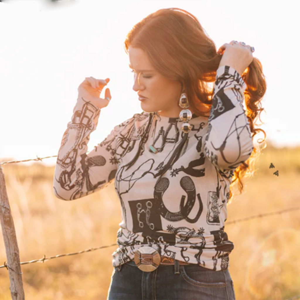 Be in style with this black and white fitted shirt adorned with bits, spurs, and horse tack. Perfect for a day at the office or a night out on the town. Saddle up anyway and show off your horse love with this unique shirt!