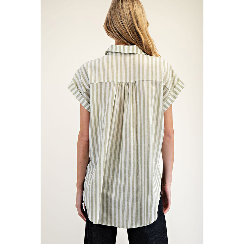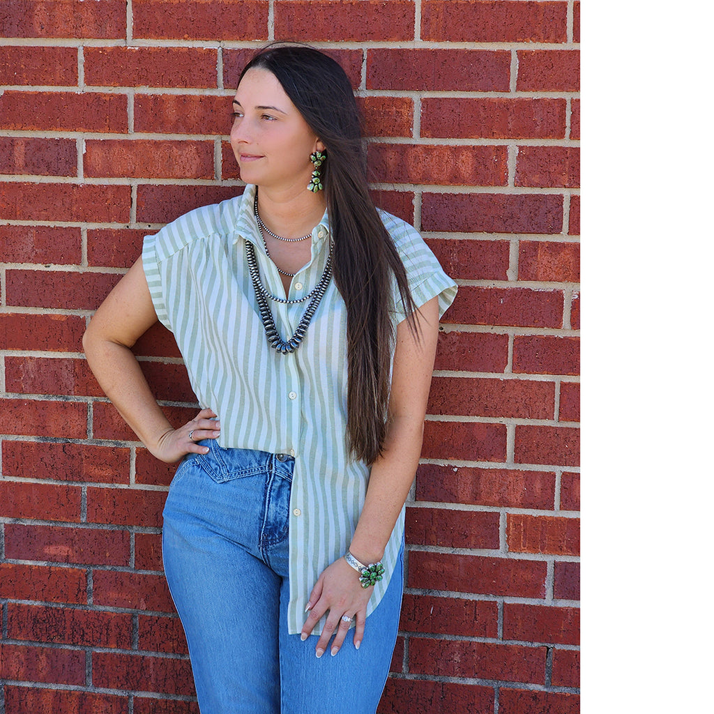 This sage and cream stripe button down shirt is the perfect combination of style and comfort. The classic button-down design is elevated with a subtle striped pattern, making it a versatile addition to any wardrobe. With its soft fabric and flattering fit, this shirt will become your new go-to for any occasion.