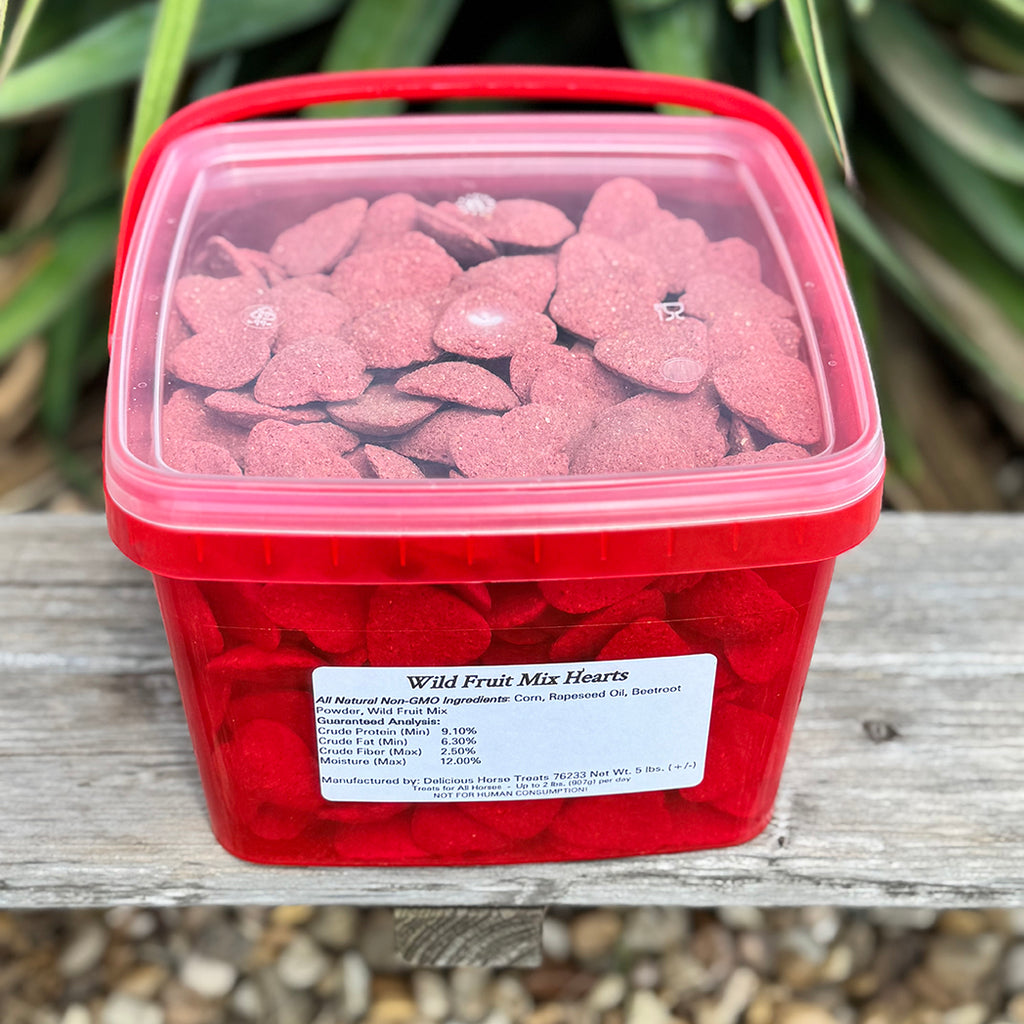 The Wild Fruit Heart treats by Delicious Horse Treats offer a nutritious and delicious snack for horses, made from non-GMO raw ingredients. These treats provide natural energy and essential nutrients, supporting your horse’s overall health and well-being.