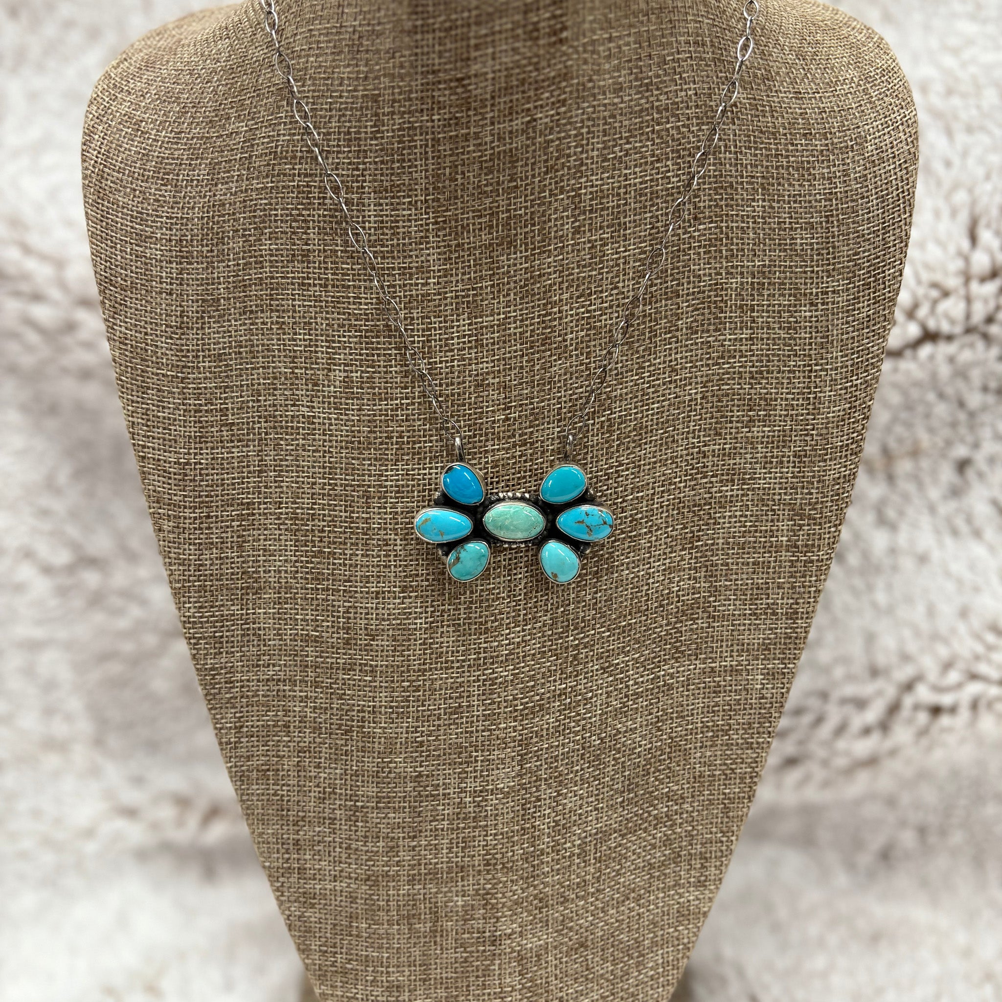 Fearlessly showcase your bold side with this striking sterling silver pendant necklace. Seven vibrant turquoise stones command attention—a stunning blue-green centerpiece anchors the design while three warm turquoise stones flank each side, creating an eye-catching geometric arrangement. Crafted in genuine sterling silver, this piece radiates confidence and southwestern charm. Perfect for those who refuse to blend in and demand jewelry that makes a statement.