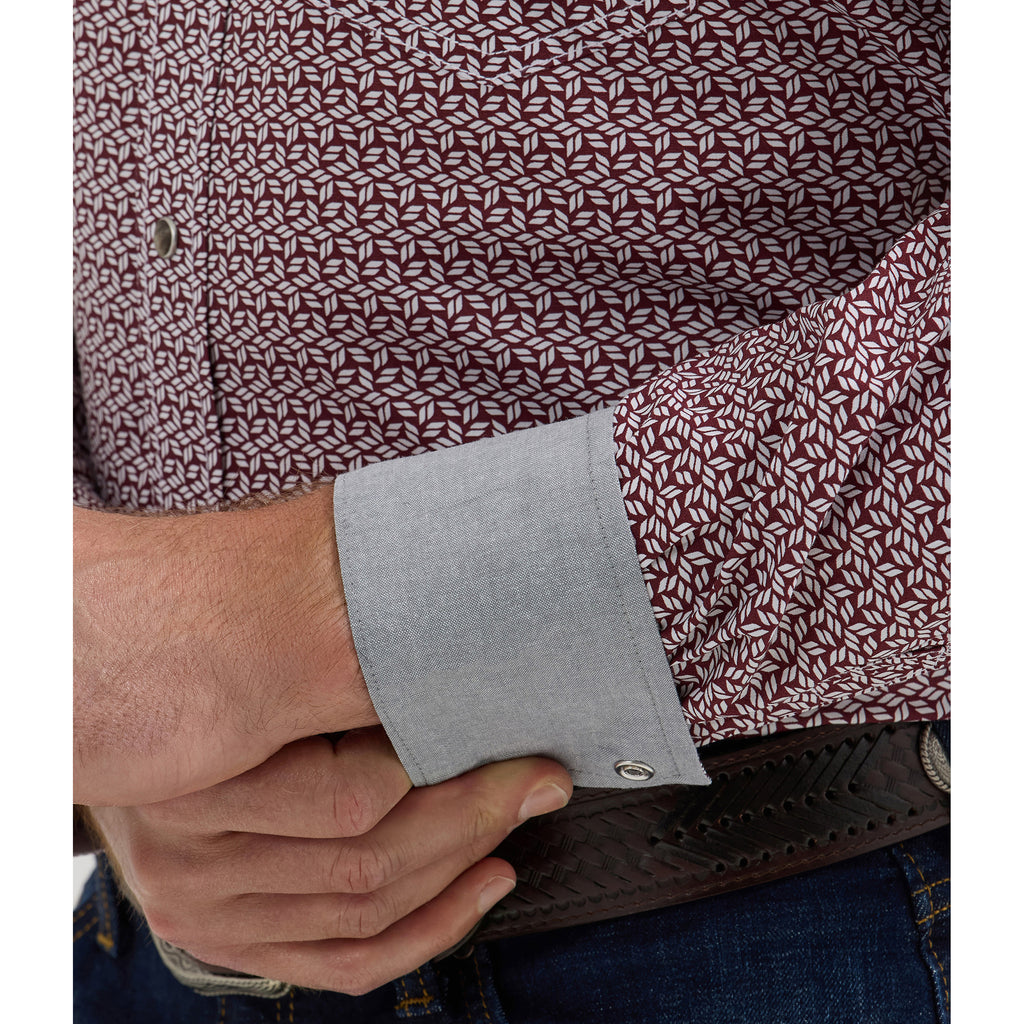 Perfectly practical Wrangler Men's 20X Snap Western Shirt. Effortlessly blending classic vibes with a modern twist, the Men's 20X Competition Advanced Comfort Snap Front Shirt ensures comfort in and out of the ring. This snap shirt boasts a spread collar, sharp yokes, two snap flap pockets, a full snap closure, and a timeless fit.