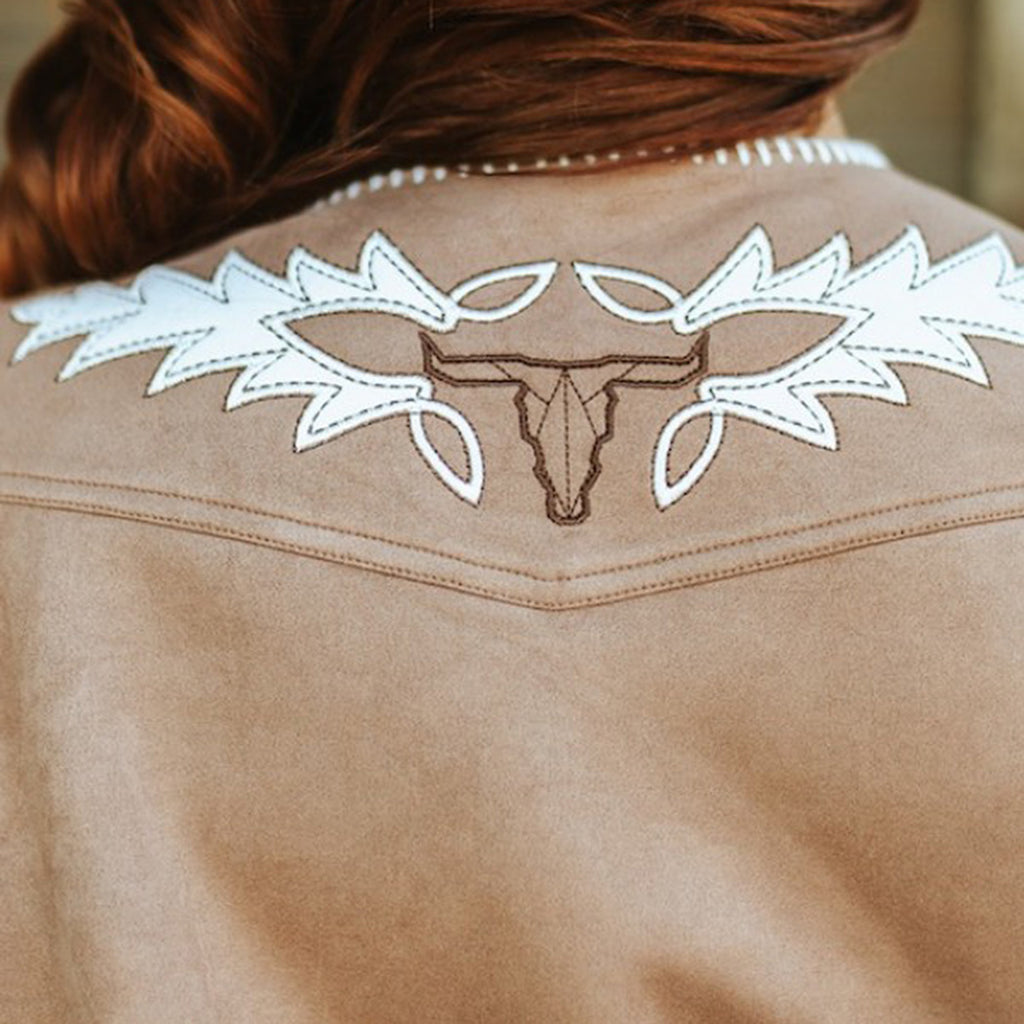 Crafted from soft camel suede, it blends rugged Western charm with bold, eye-catching details. Perfect for making a statement, this vest adds a fearless edge to any outfit while offering comfortable wear and timeless appeal.