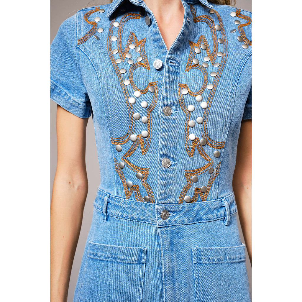Step into Western style with the Women's Denim Brown Boot Stitched Romper, a playful one-piece that blends rugged charm with feminine flair. Made from a soft, stretch-infused denim blend, this romper features contrast boot stitching and a tailored silhouette that hugs in all the right places. The rich brown hue adds warmth and versatility, while the stitched boot detail nods to classic cowboy heritage.