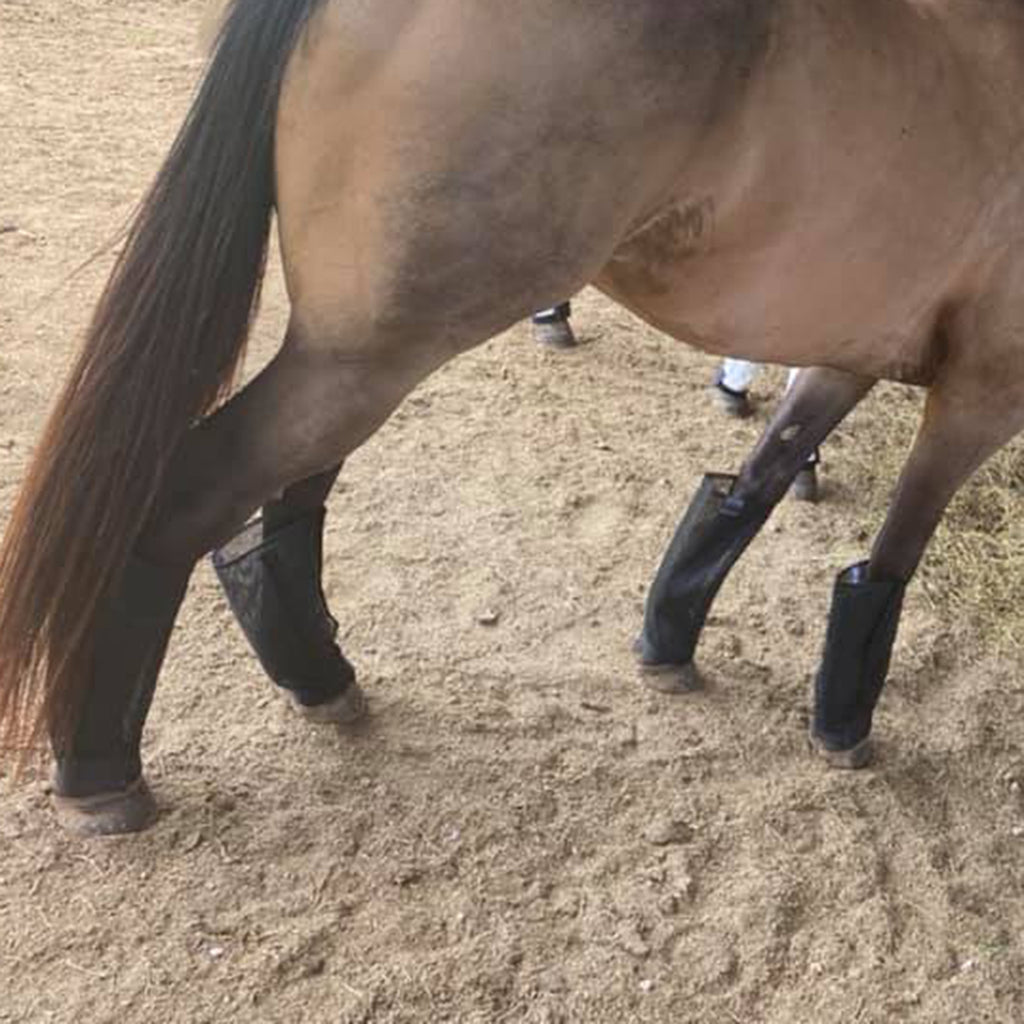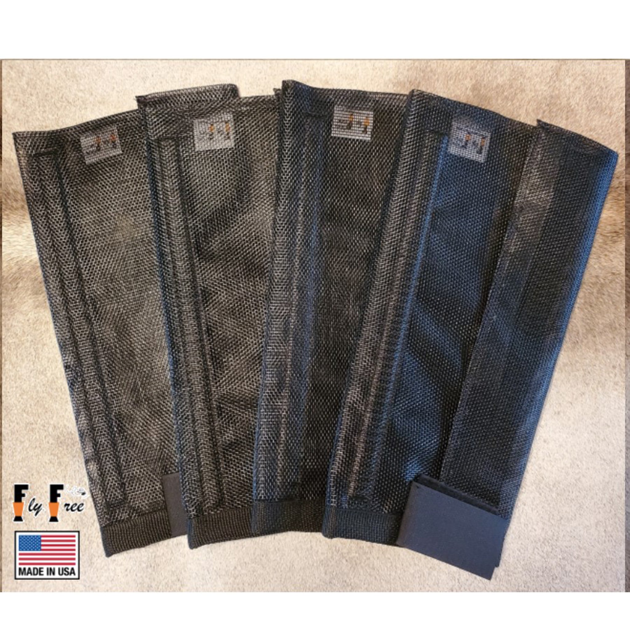 These made in America fly boots help prevent insect bites and botfly eggs on horses legs. They also help to reduce joint inflammation, hoof wear, and shoe wear from repetitive stomping. A new feature that the Fly Free boots differ from other brands is there "stay on" Velcro fasteners, which is comparable to one you would see on an over reach boot. With this new feature, most spend little to no time at all pasture hunting for fly boots. Another advantage to these boots is they also help with scratches by keeping morning dew off the horses legs.