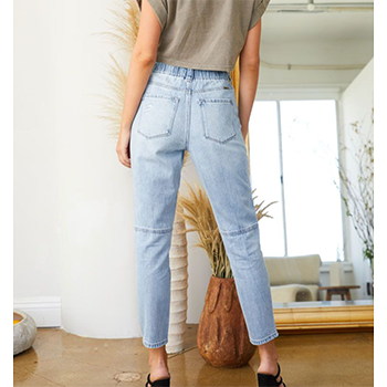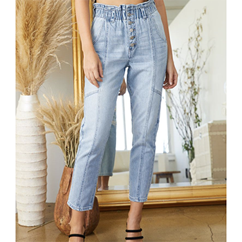 A fun new jean that we promise you will love. These Kancan Paper Bag Mom Jeans are so comfy, yet super stylish. Pair with a great graphic tee and an awesome pair of booties, and you will have a fun dressed up look. These jeans are so easy to style for dress or casual wear. 100% Cotton, means true all day fit with no sagging throughout the day.