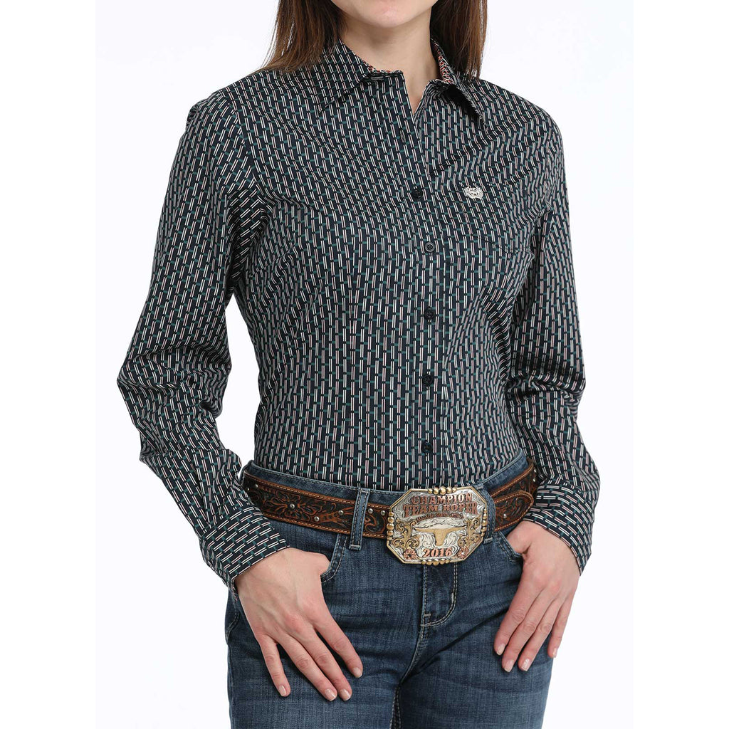 This Navy geo print long sleeve shirt by Cinch offers both style and comfort. Its unique design adds a touch of personality to any outfit, while the long sleeves provide warmth on colder days. Durable and versatile, this shirt is a must-have for any wardrobe.