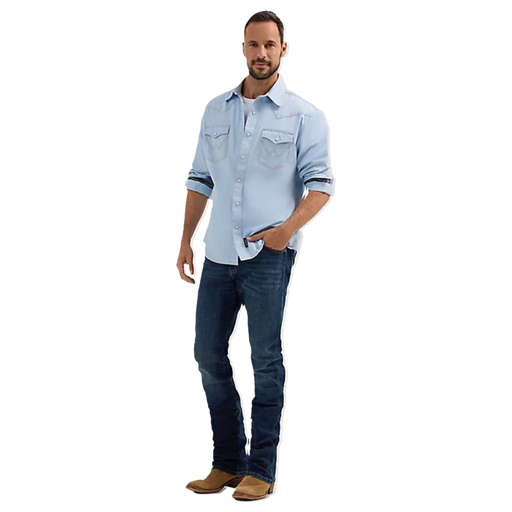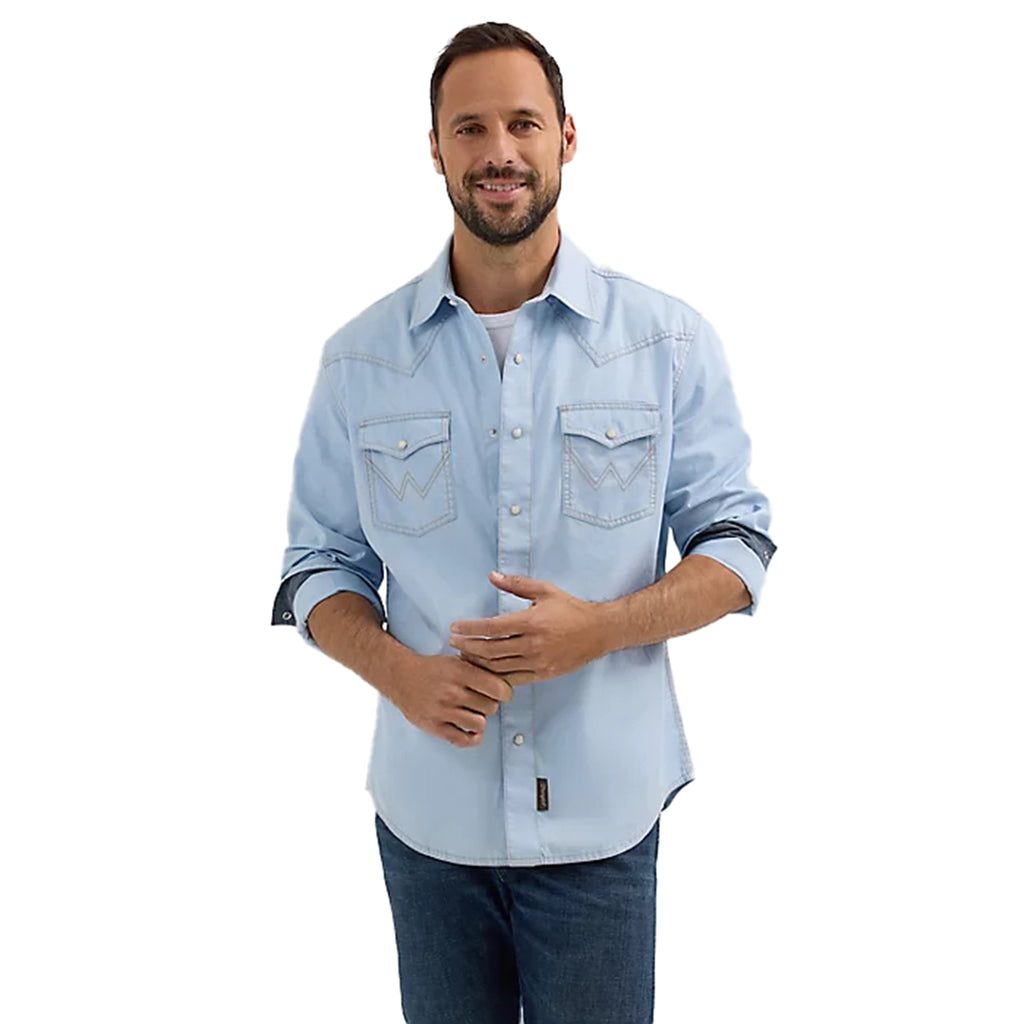 Keep it cool Western style with our men's Wrangler Retro® premium western snap shirt in ice blue. Made from comfortable cotton, this contemporary classic features signature details including contrast trim, dual snap flap pockets with iconic 'W' stitching, snap cuffs, and full snap closure. Whether tucked in or worn casually, this versatile long-sleeve pairs perfectly with any wash of Wrangler jeans for a genuine American West look.