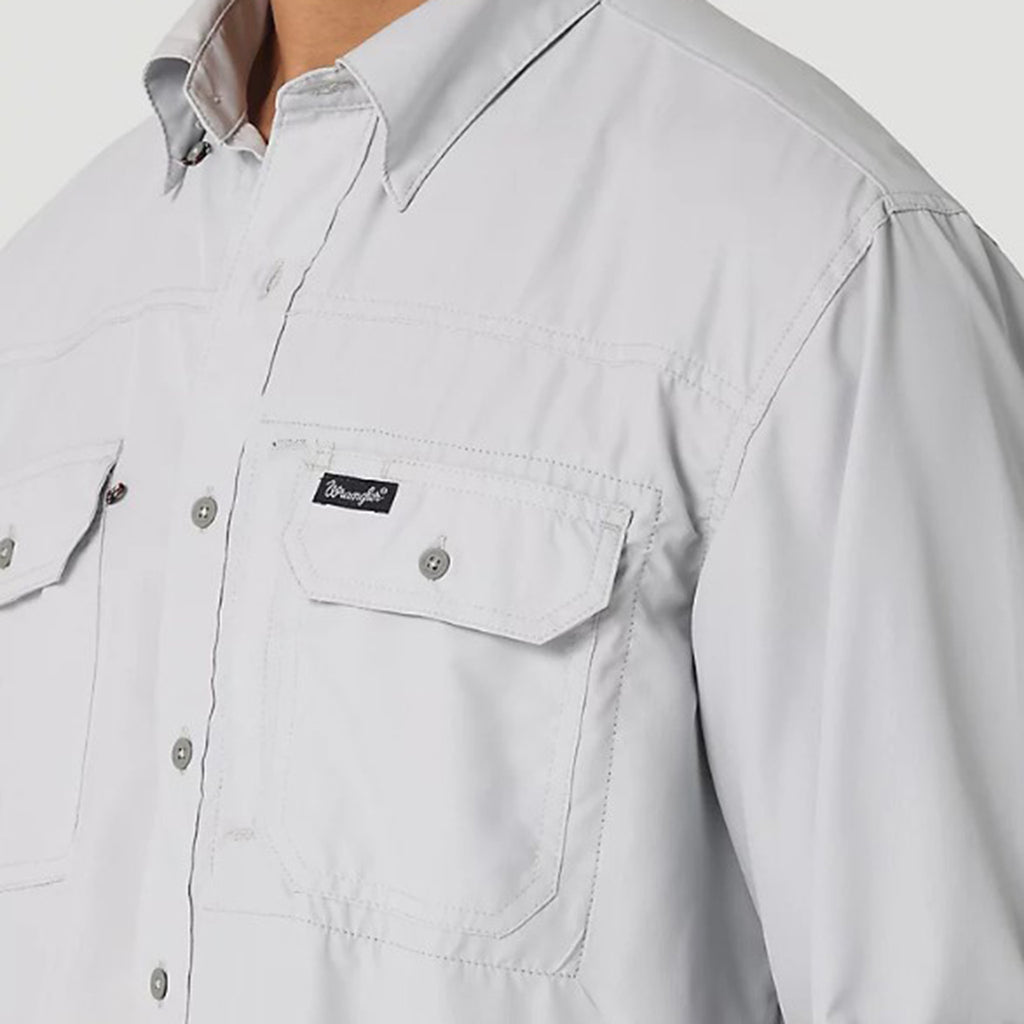 This men's Western performance shirt features a breathable, stretchy construction with a vent at the sides for extra comfort. It's equipped with moisture-wicking technology, UV sun protection, a convenient glasses cleaner at the hem, and a convertible sleeve system.