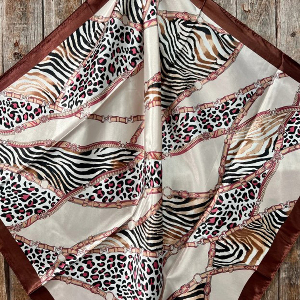 The Tan Rodeo Drive Animal Print Wild Rag features a Copper Turquoise Western Concho Slide measuring 1.5", making it the ideal accessory for any rodeo or evening outing. Easily styled with a simple knot or enhanced with the addition of a concho slide.