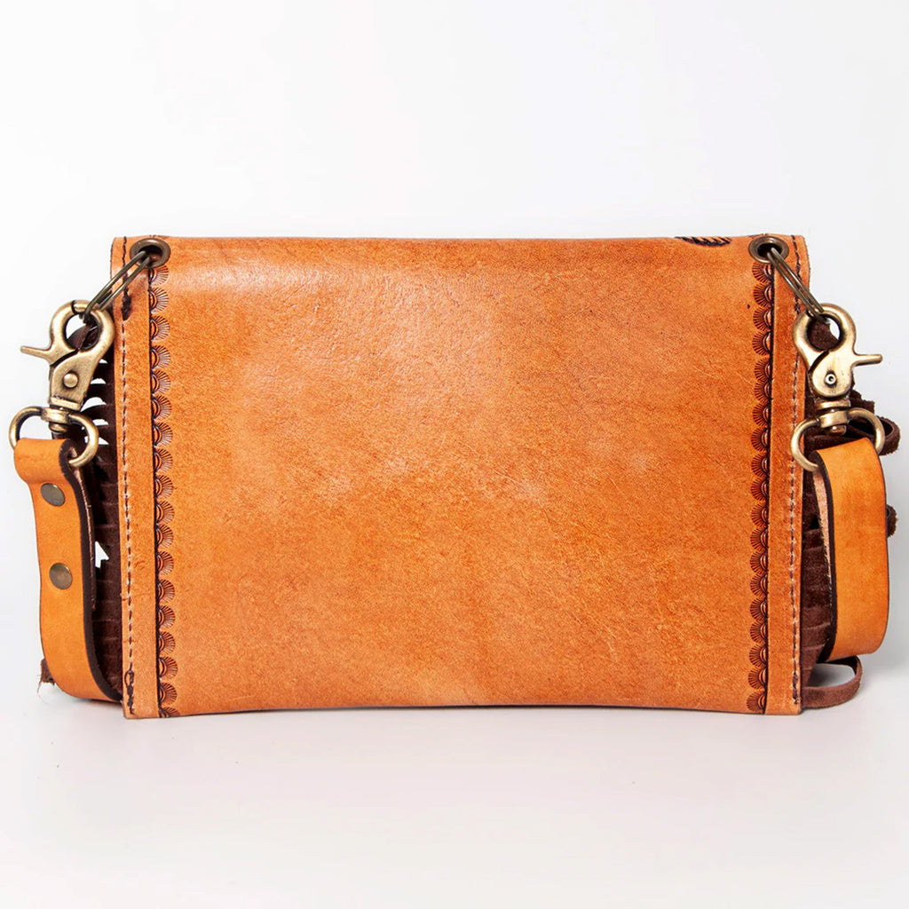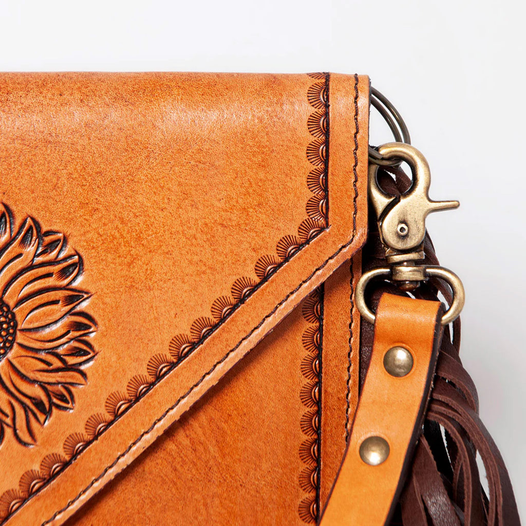 Make a bold statement with the American Darling Sunflower Tooled Fringe Leather Envelope Crossbody. Crafted from rich leather, its intricate sunflower tooling and playful fringe detail bring a fearless, artistic edge to your look. The envelope design keeps essentials secure while adding a sleek silhouette, perfect for those who dare to stand out. Embrace your wild side with this standout accessory that blends rugged charm and feminine flair effortlessly.