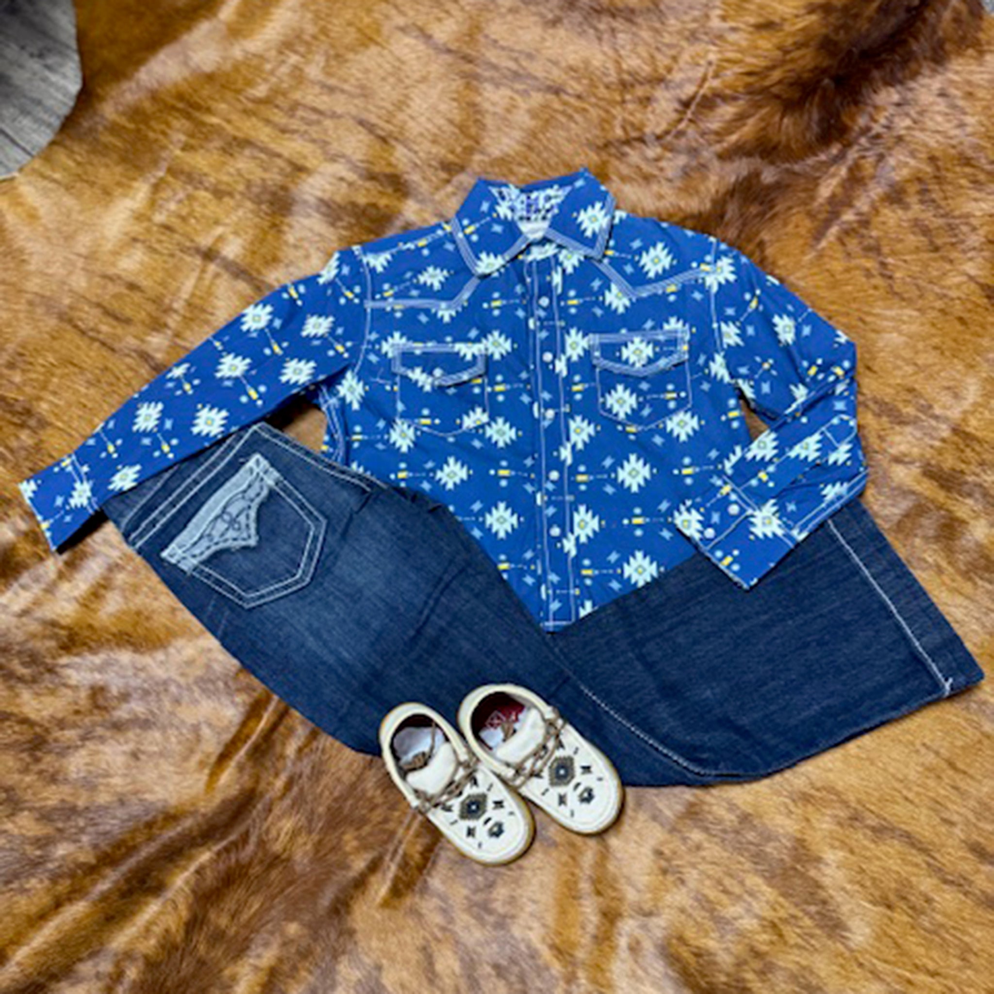 Brighten your child's wardrobe with this vibrant long sleeve shirt featuring a bold blue and yellow Aztec print. The eye-catching geometric design brings playful style to everyday wear, while the comfortable long sleeves provide versatile layering for any season. Perfect for school, casual outings, or weekend adventures, this shirt combines fun colors with timeless tribal-inspired patterns that kids love.