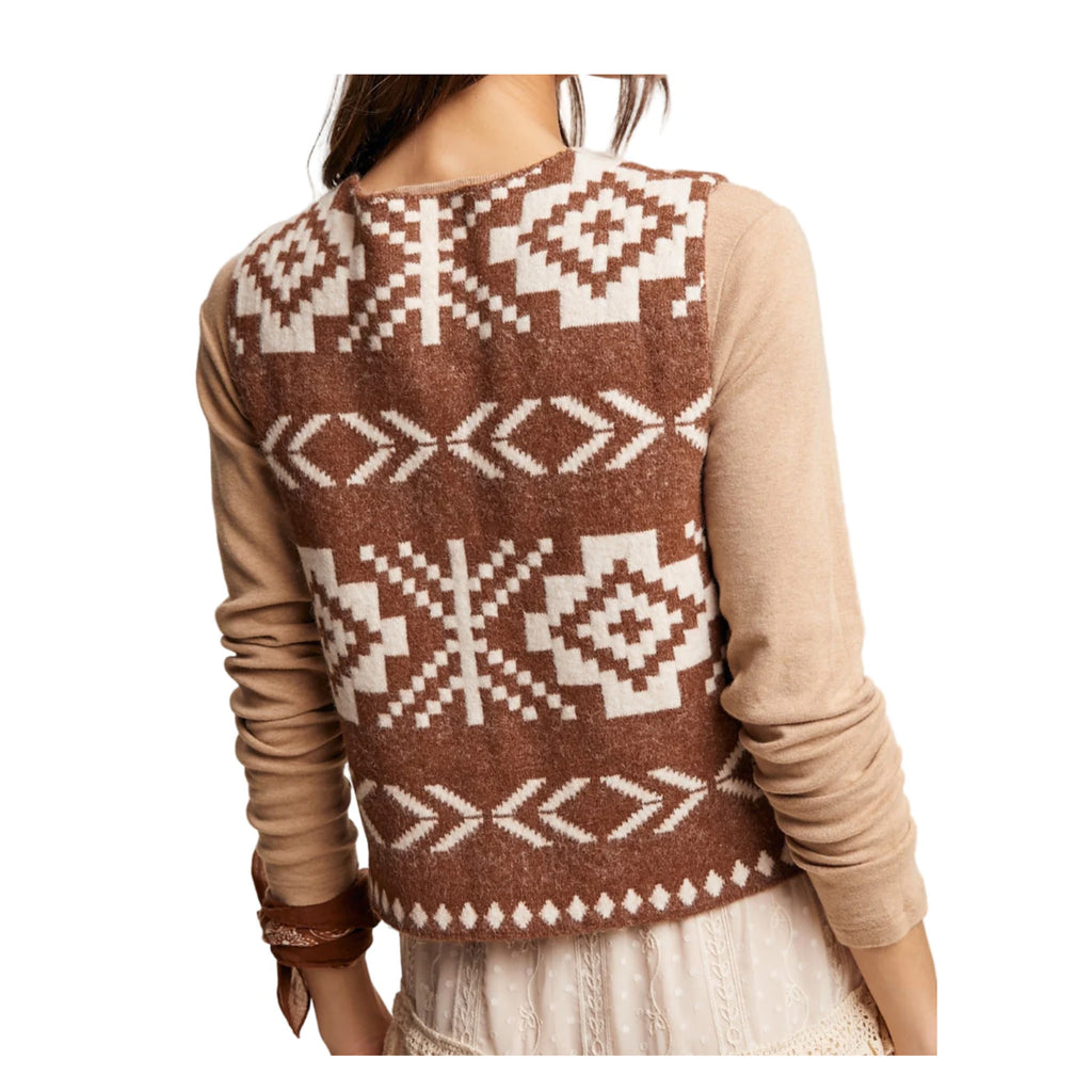 Featuring eye-catching geometric patterns inspired by ancient Aztec designs, this statement piece commands attention with its rich amber brown tones and classic button front. Perfect for layering over your favorite tee or dress, it adds an edgy, adventurous flair to any outfit. Whether you're channeling vintage Western vibes or making a contemporary fashion statement, this vest proves that daring style never goes out of style.
