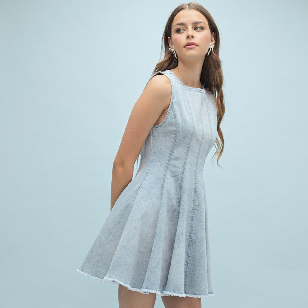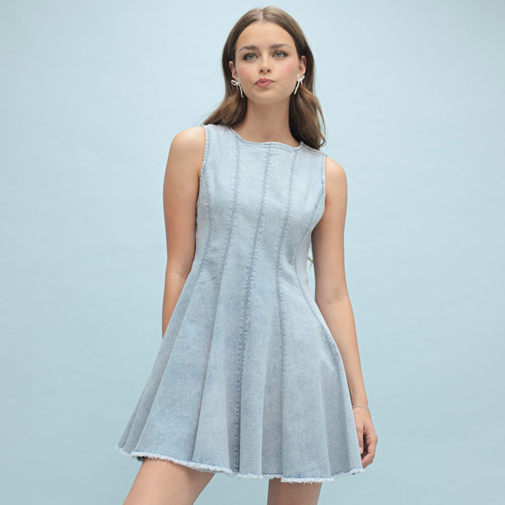 Made with high-quality denim, this dress will provide both style and comfort. Perfect for any occasion, it features a flattering flared cut and beautiful seam detailing. Elevate your look with this versatile piece.