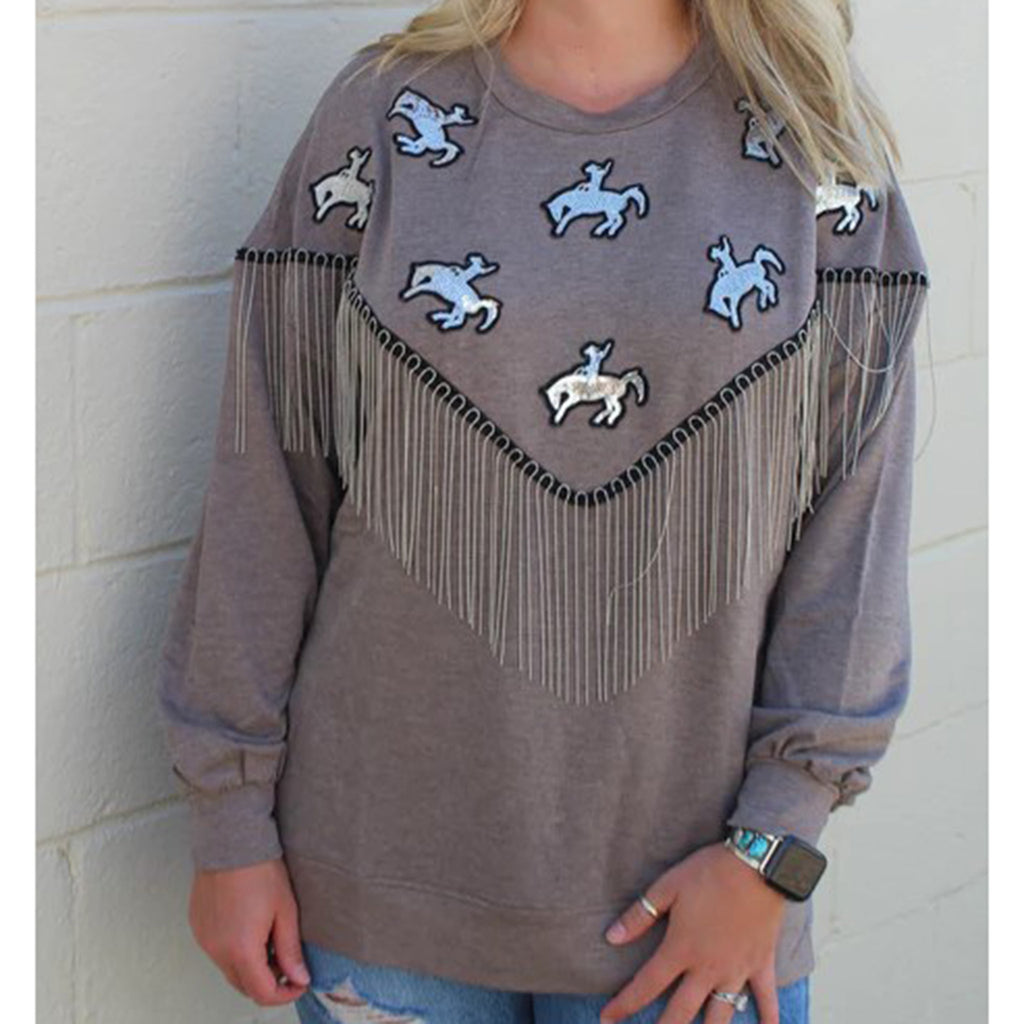 Rowdy Crowd Women's Grey with Sequins Bronc Fringe Sweater