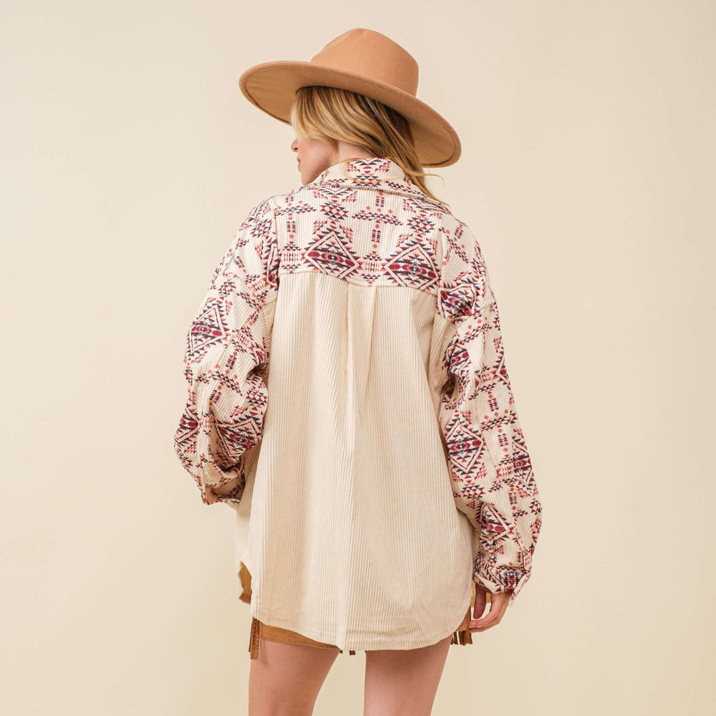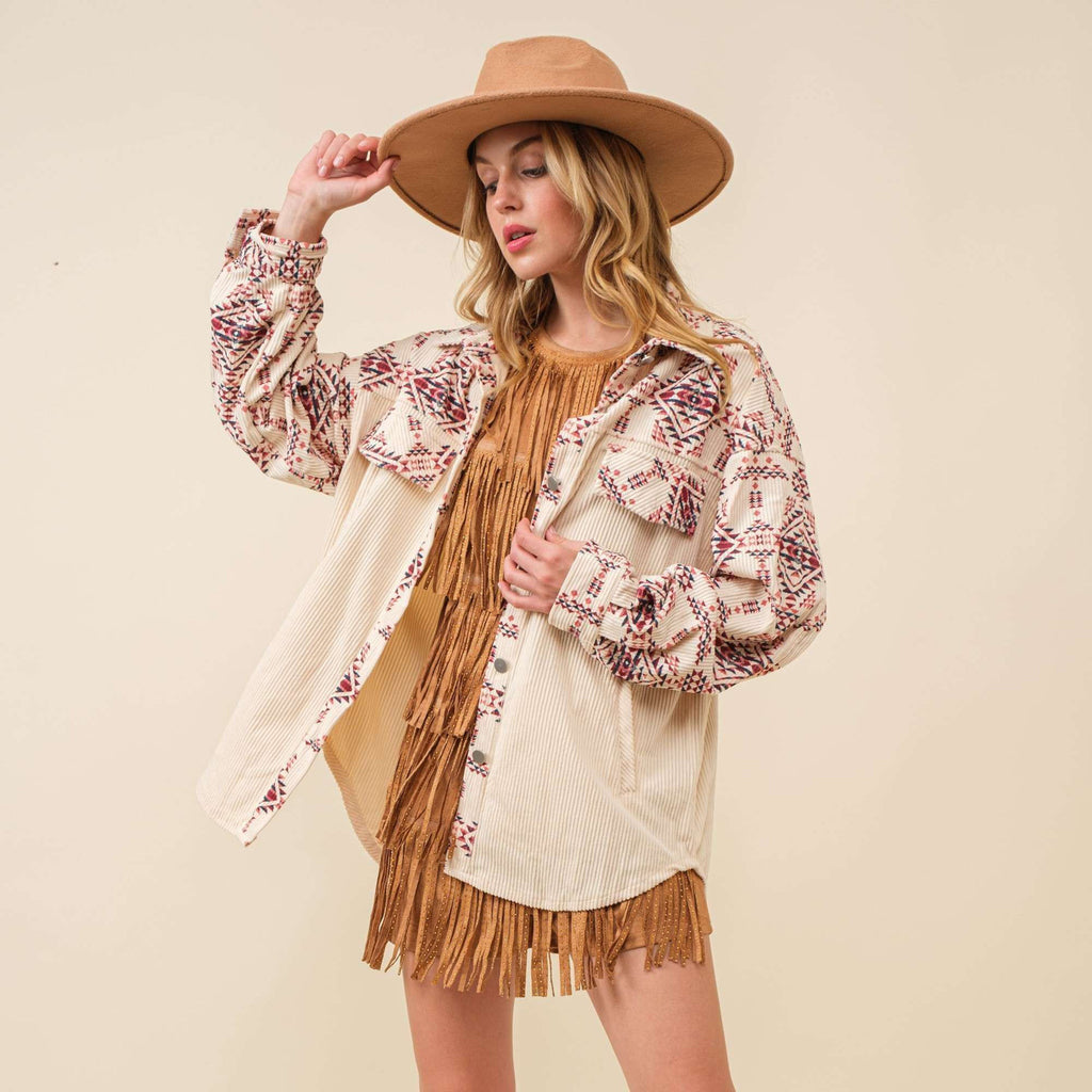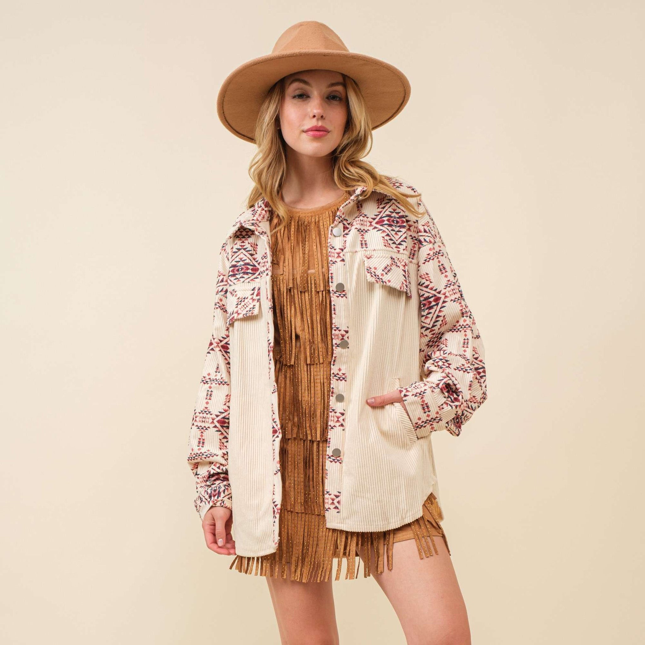 Get ready to make a statement with the Main Strip Ivory Aztec Shacket! This oversized shacket features a collar neck, button down front, and pockets for added convenience. The contrast Aztec print paired with solid corduroy adds a unique touch to this 100% POLY shacket. Stay stylish and comfortable in this must-have piece.