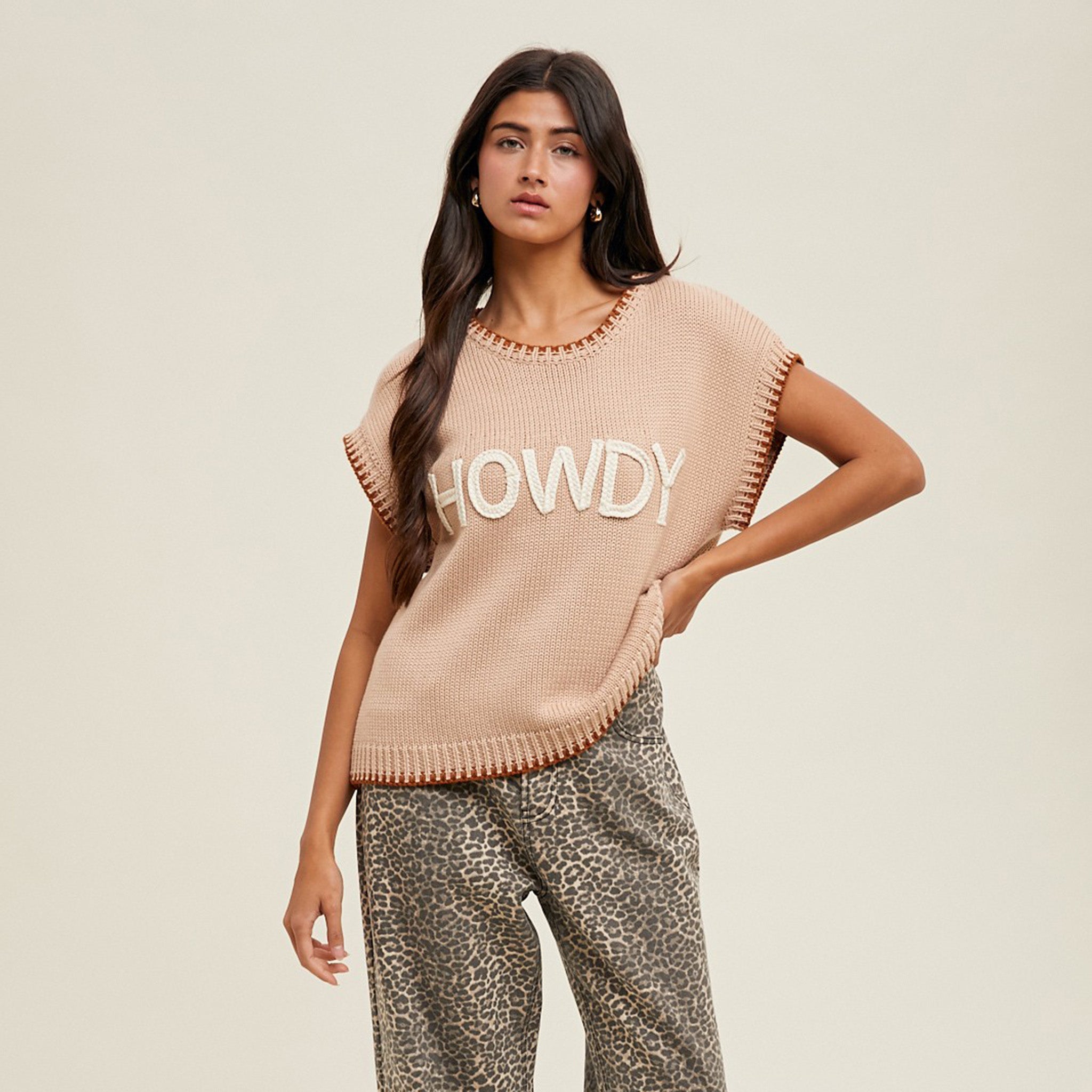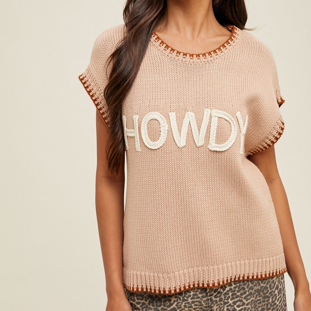 Add a splash of fun to your wardrobe! This cozy, tan knit features a cheerful "Howdy" design that’s perfect for brightening up any day. Its short sleeves keep things light and breezy, making it a playful choice for layering or wearing solo. Pair it with your favorite jeans for a casual, friendly vibe that says hello in style!
