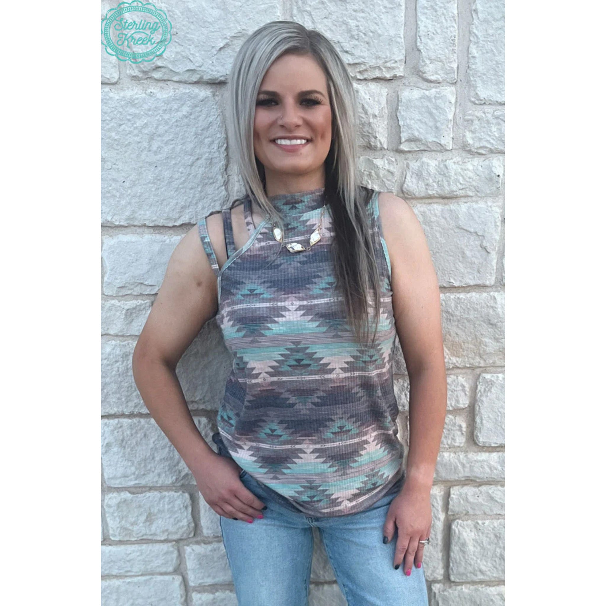Add a splash of southwestern charm to your wardrobe. Featuring turquoise and subtle grey hues in a bold Aztec pattern, it’s perfect for sunny days and playful vibes. The ribbed fabric and three straps on one side keep you cool and comfy, whether you’re out exploring or just relaxing. Embrace your adventurous side with this fun and stylish tank top!