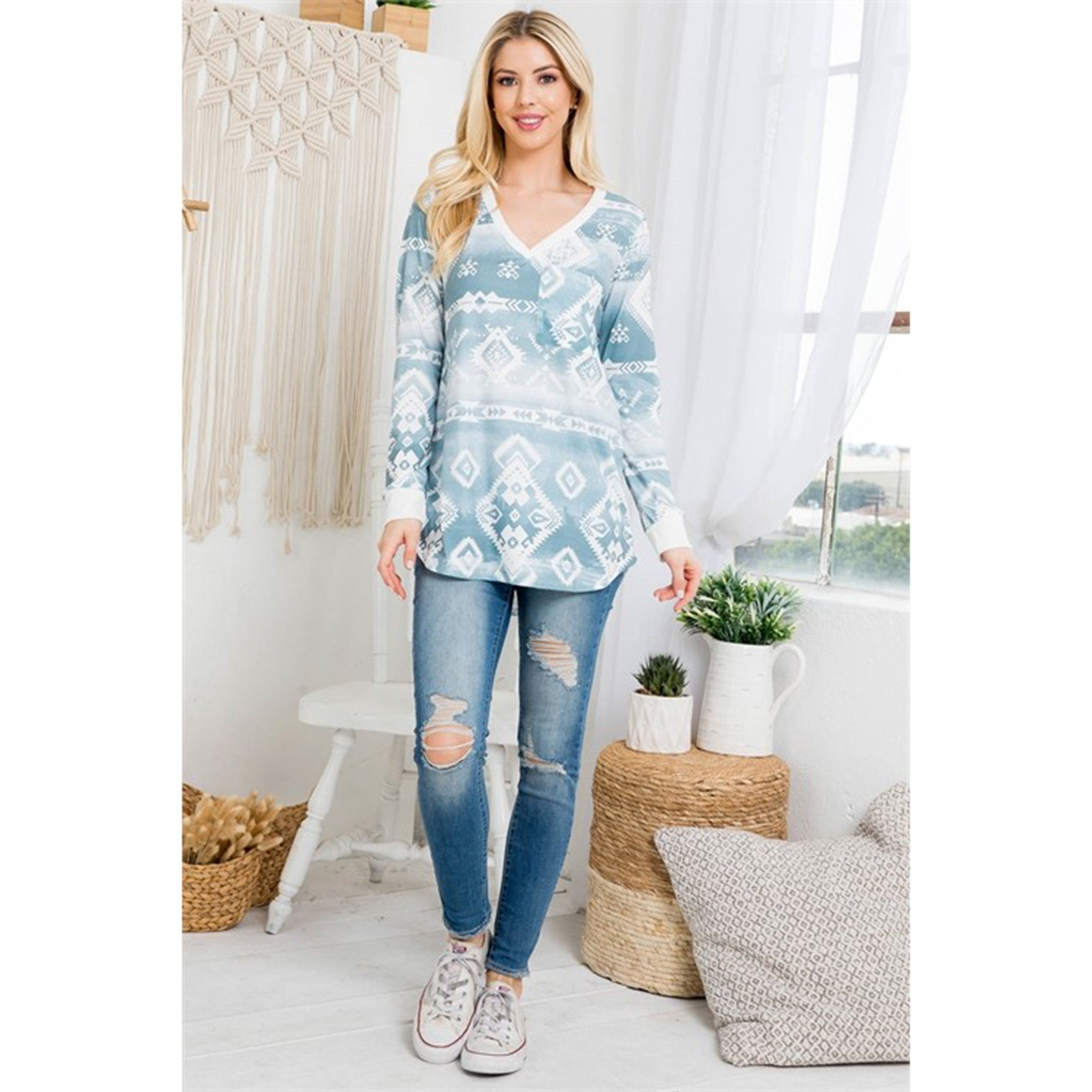 Avery Women's Aztec Print V Neck Long Sleeve Top
