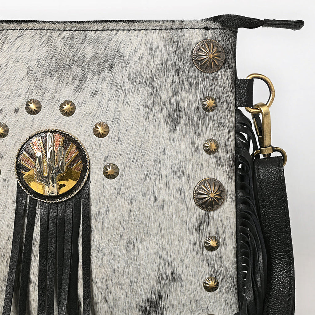 - Black and white cowhide purse with gold cactus concho