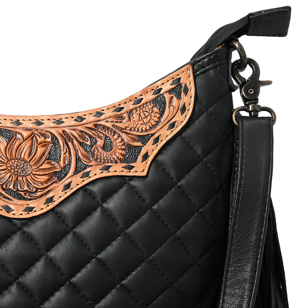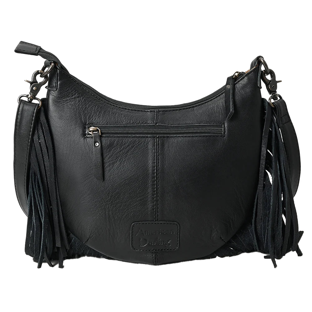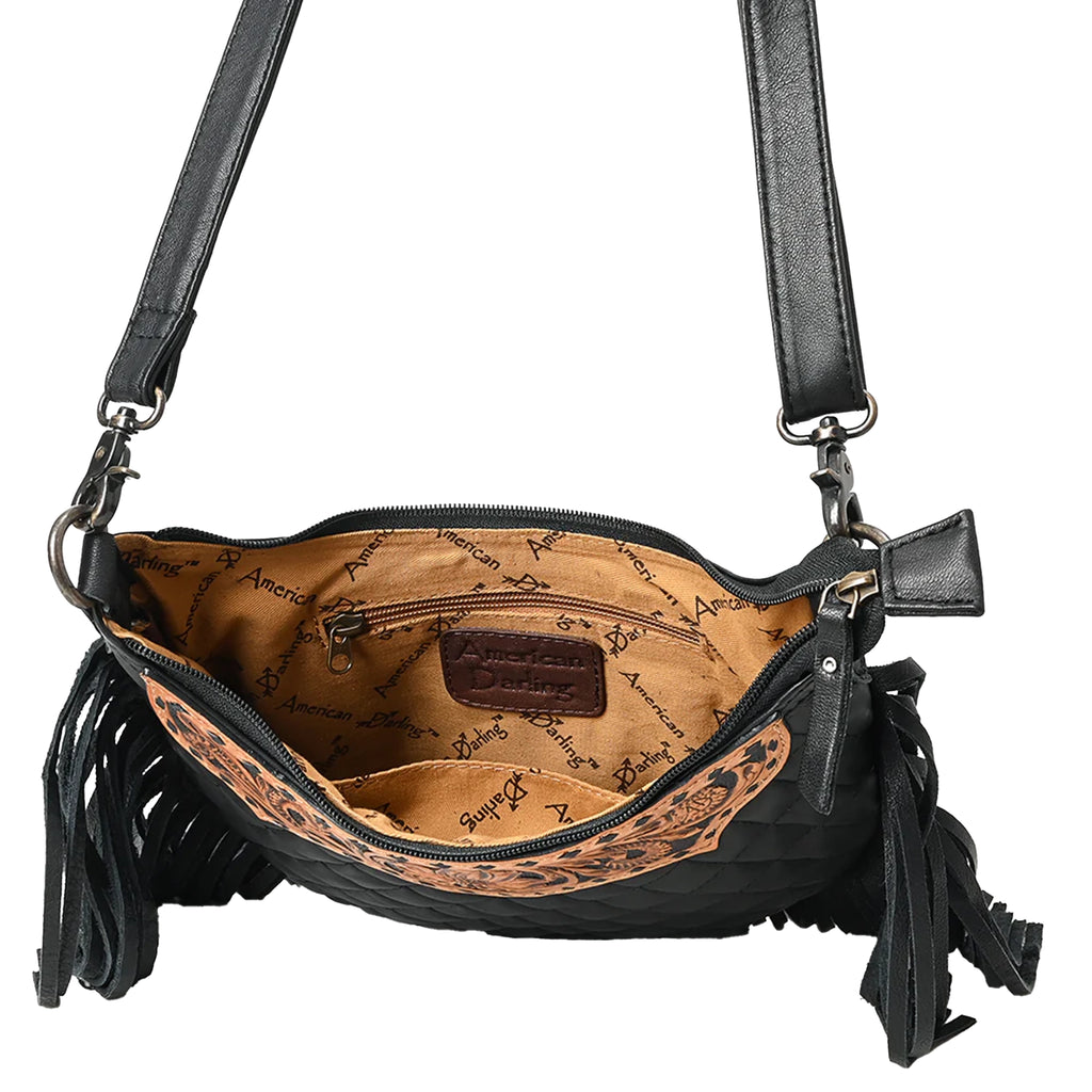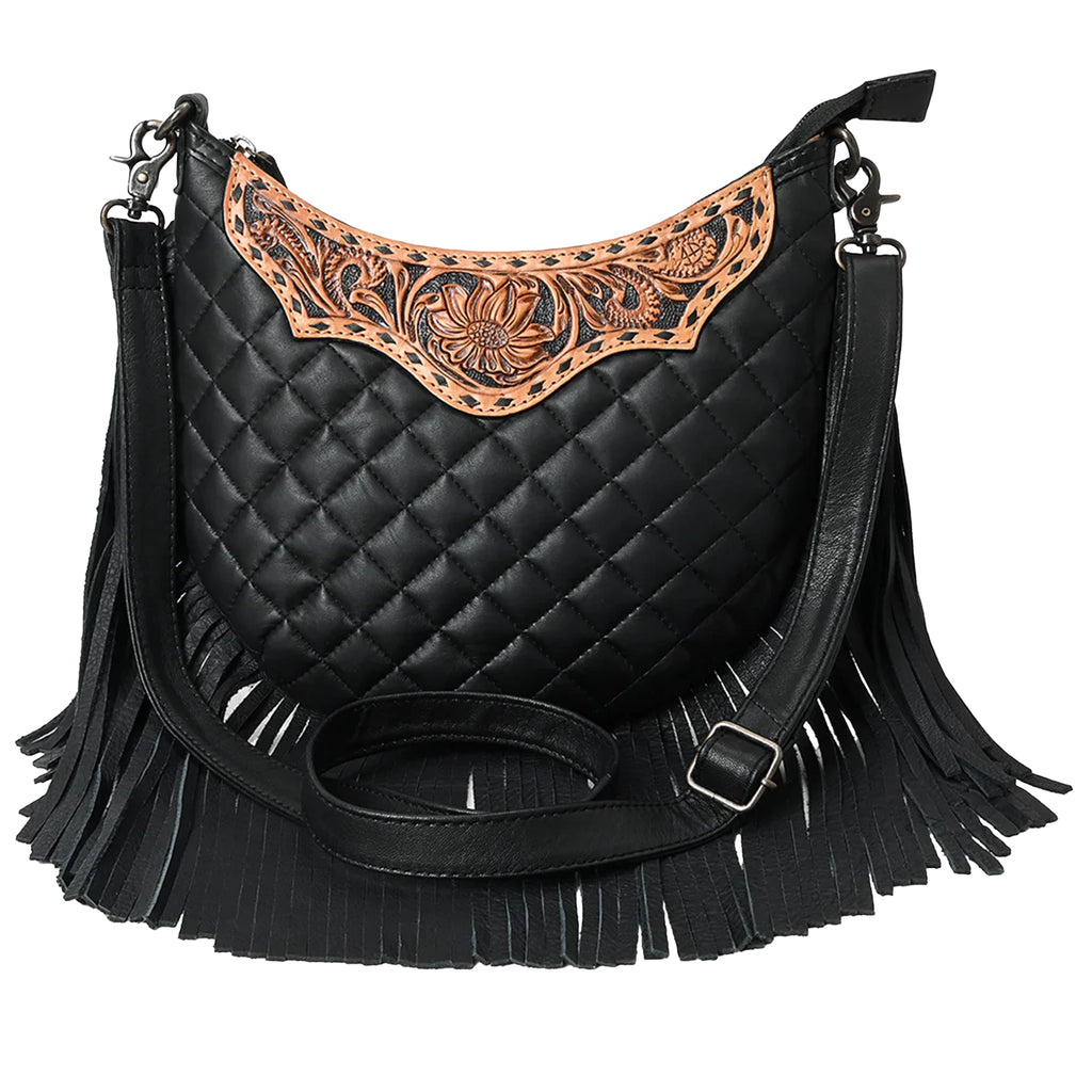 Experience the perfect blend of style and function with the American Darling Floral Tooled Fringe Crossbody Purse. Made from genuine leather in classic black accented with warm tan, it features beautifully detailed floral tooled trim for a unique, handcrafted look. The adjustable crossbody strap with convenient snaps offers customizable comfort, while the durable YKK zip closure keeps your belongings secure. This purse is designed to elevate your everyday outfit with lasting quality and distinctive charm.