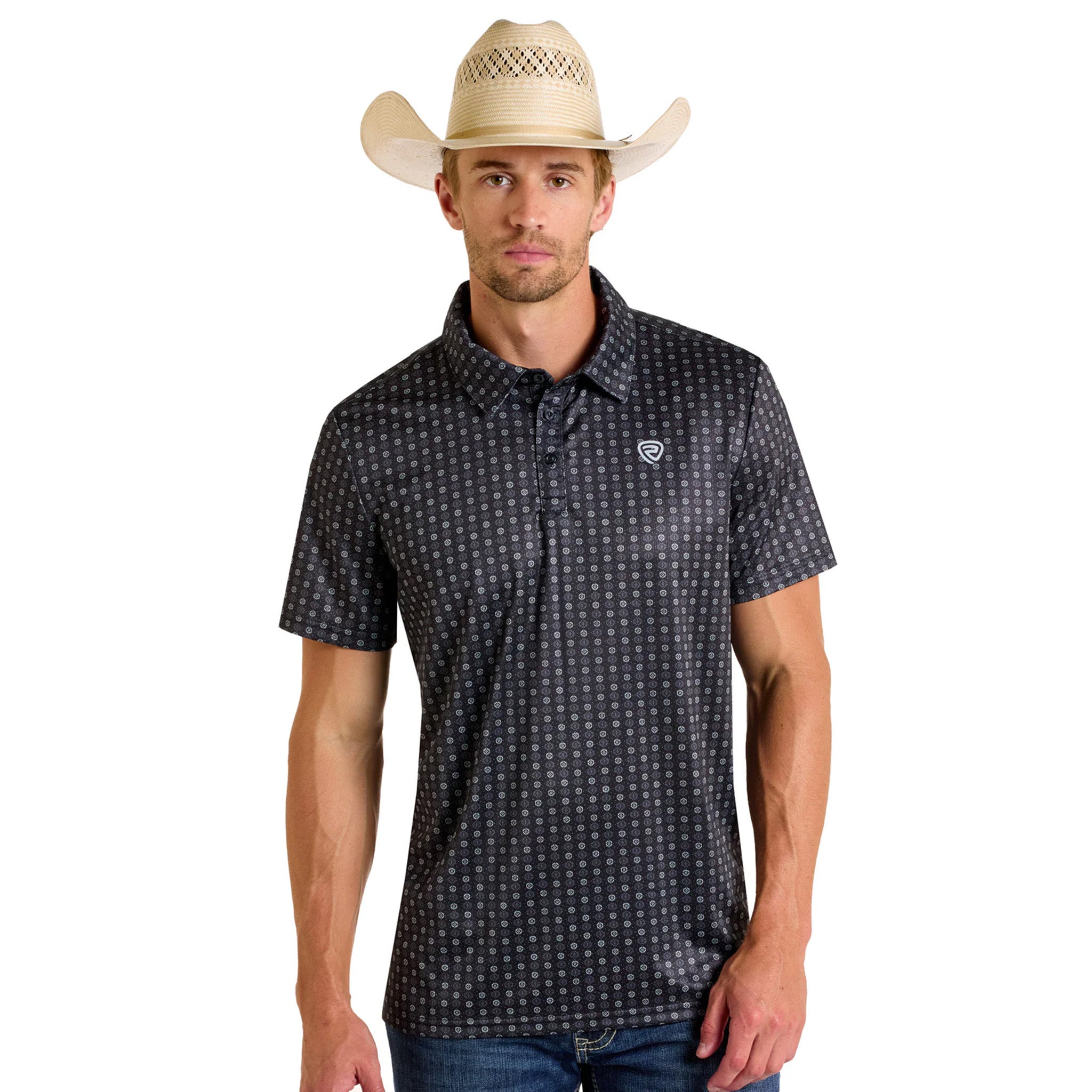Step into style with the Rock & Roll Cowboy Men's Black Geo Print Polo. Featuring a bold geometric pattern on a sleek black background, this polo adds a fun twist to your casual wardrobe. Perfect for those who want to stand out with a playful edge while staying comfortable all day long. Whether you're hitting the town or just kicking back, this shirt brings a fresh vibe to your look.