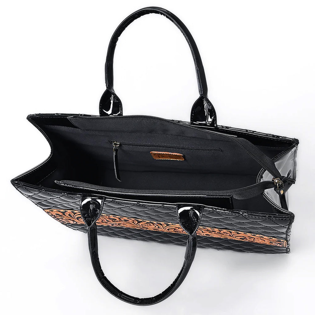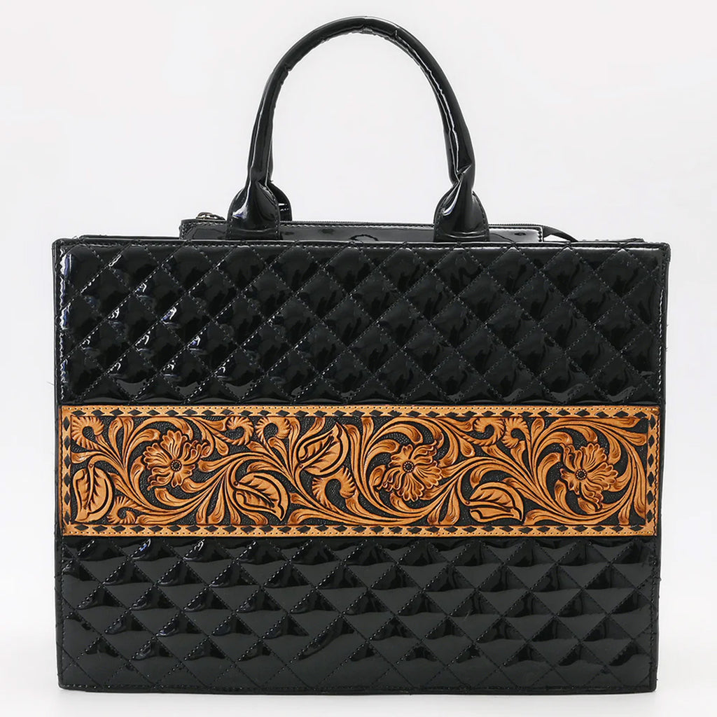 The American Darling Hand Tooled Genuine Leather Tote combines exquisite craftsmanship with timeless elegance. Made from high-quality genuine leather, its hand-tooled design adds a unique, artisanal touch. Spacious and thoughtfully designed, this tote offers ample room for your essentials while maintaining a refined silhouette. Perfect for those who appreciate sophisticated style and durable quality in one versatile accessory.