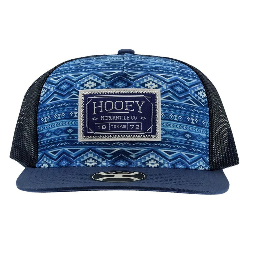 This new "Doc" Hooey cap is a standout with this colorful blue pattern scheme! It features a hybrid bill, has an adjustable back for a great fit. In addition this cap has a unique blue and white "Hooey Mercantile Co" front patch and also a Hooey logo in grey on the bill.