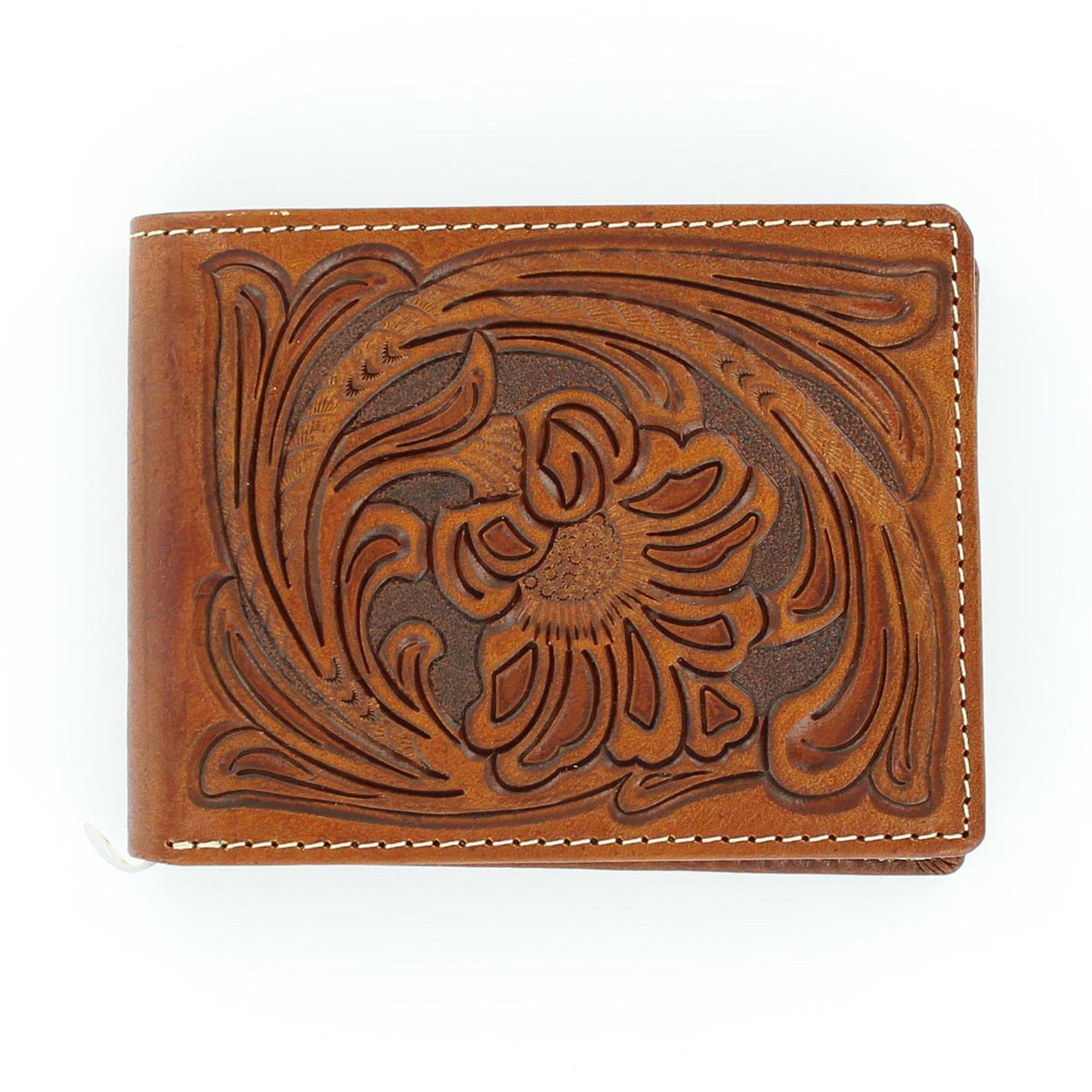 This brown floral tooled leather bi-fold wallet from Nocona features a removable pass case and picture holder. Multi card slots, protective ID window, cash divider and tooling only on front.