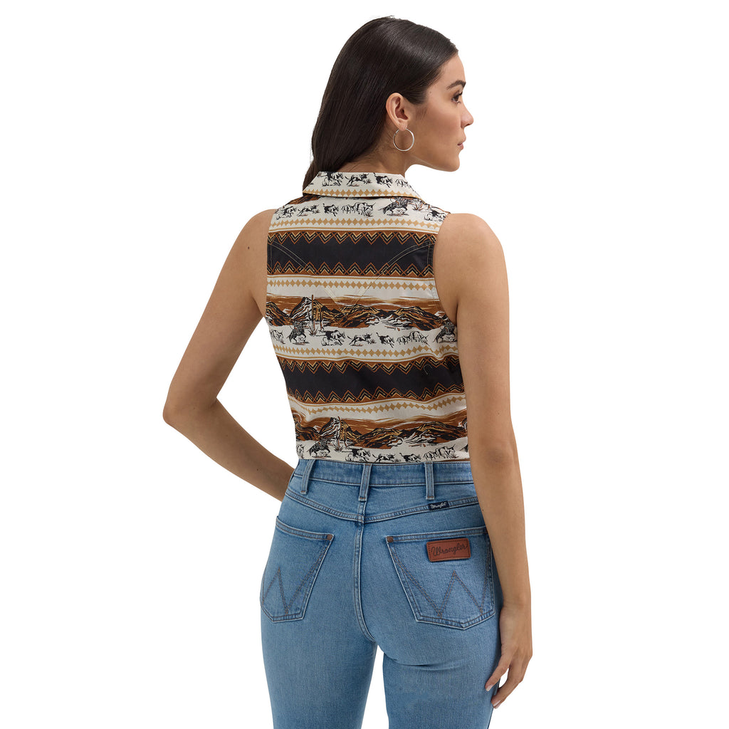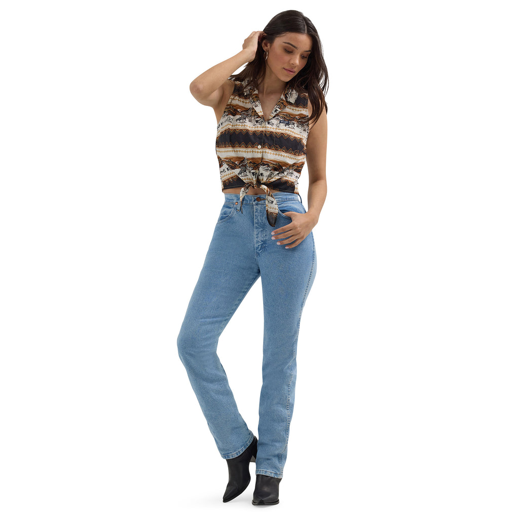 Embrace your inner cowgirl with this sleeveless Western-inspired shirt designed for all-season wear. Made from soft cotton poplin, this Women’s Printed Tie Front Shirt features a button-down front and a playful tie at the waist, creating a flirty cropped fit that highlights your curves perfectly.