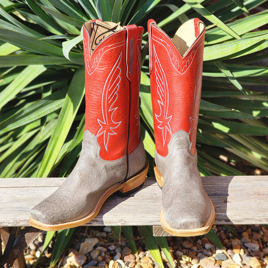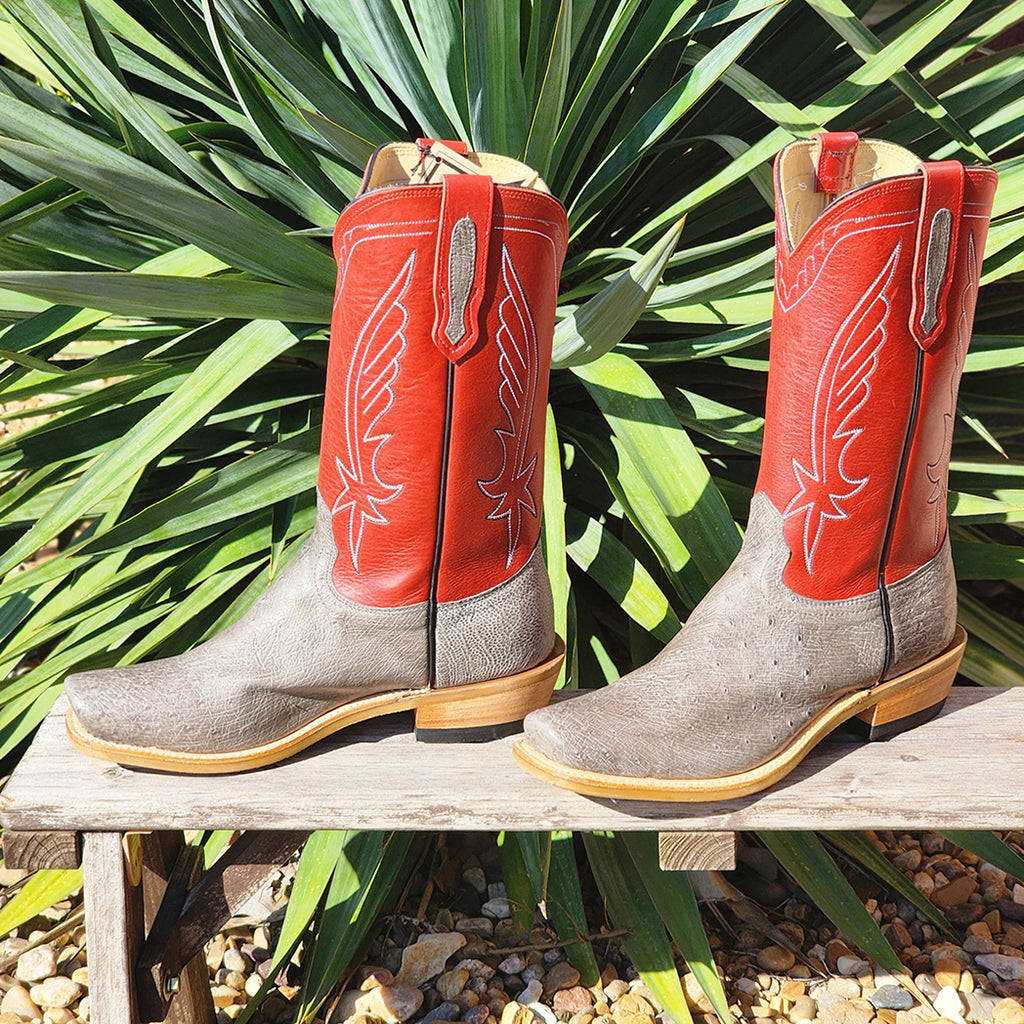 Expertly crafted Fenoglio Smooth Ostrich Cutter Toe boots with red shaft. Made from genuine smooth ostrich leather, these boots offer luxurious comfort and durability. Perfect for any occasion, these boots are a stylish addition to any wardrobe. Upgrade your footwear game with these premium boots.