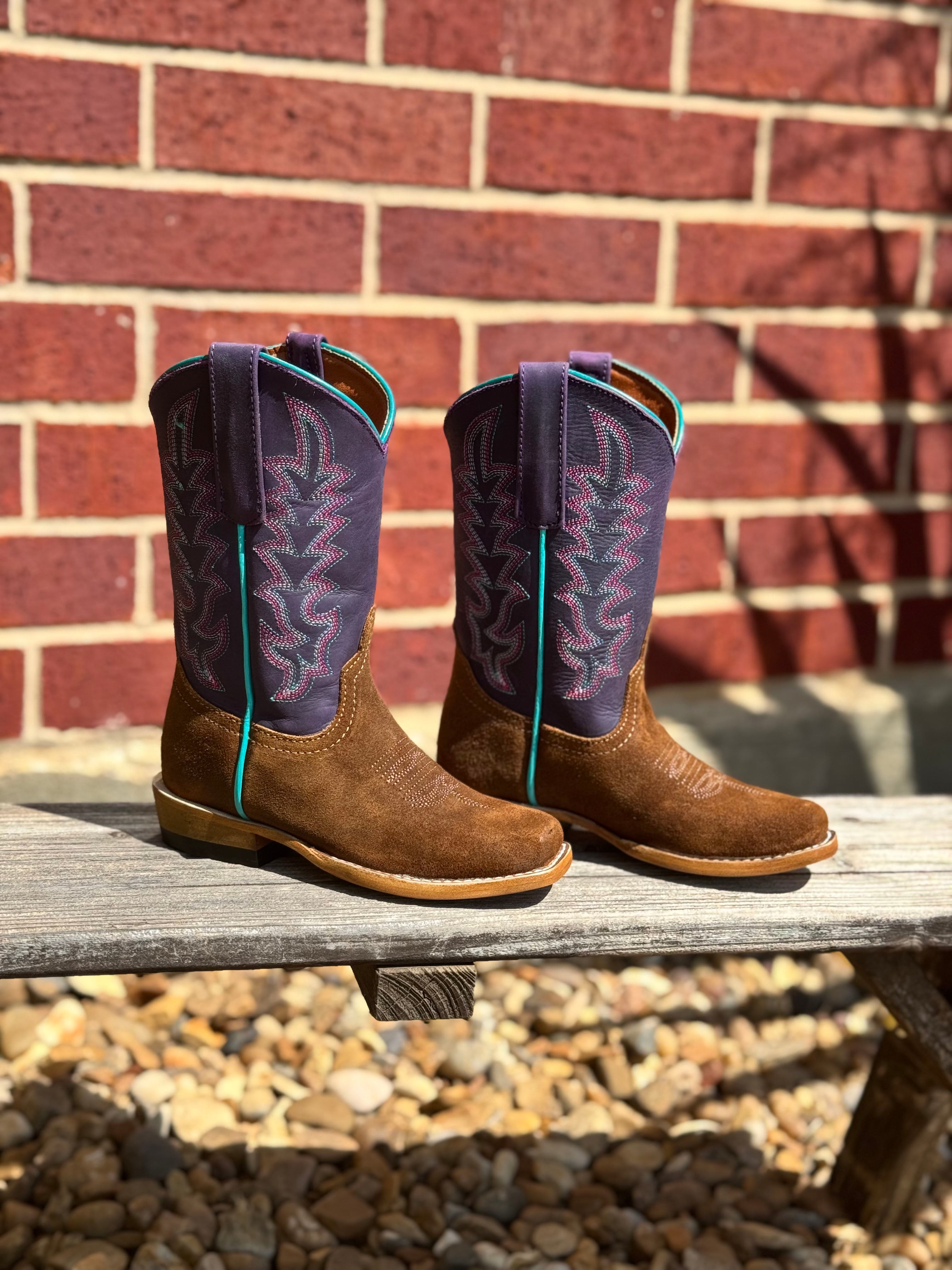 Step out in style with the Macie Bean Girls Brown and Purple Boots! Featuring rich snuffy waxy commander vamp leather with a vibrant purple Nashville top, these boots bring bold flair to every outfit. The HN toe shape pairs perfectly with a fun cowgirl heel, while a classic leather sole ensures durability and comfort. Perfect for young cowgirls!!!
