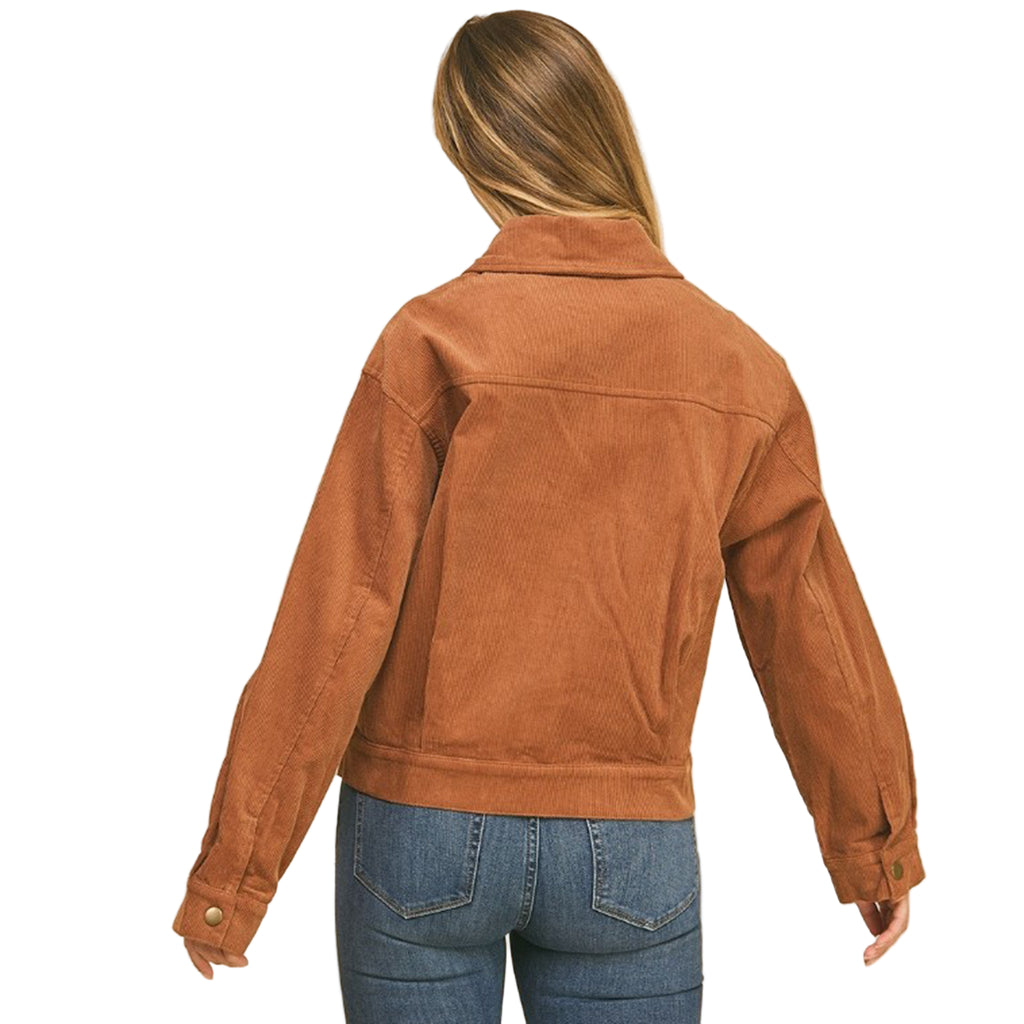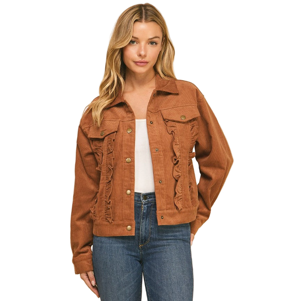 Elevate your everyday style with this charming camel corduroy jacket that's anything but ordinary. Featuring delicate ruffles that add a touch of whimsy and texture, this piece brings personality to any outfit. The warm, neutral camel tone pairs effortlessly with your favorite jeans, dresses, or skirts, making it a versatile wardrobe essential. Perfect for layering through the seasons, this jacket is your new go-to for looking put-together with a fun twist.