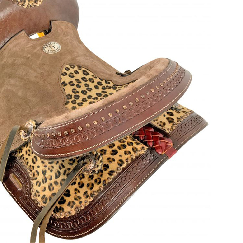 This saddle is a rough out chocolate brown in color and features a cheetah print inlay in seat. Saddle is accented with hair on cheetah accents on the skirts, pommel, and stirrups. Features copper colored conchos with copper dot accents. Saddle comes equipped with front D rings, leather latigo and off billets.