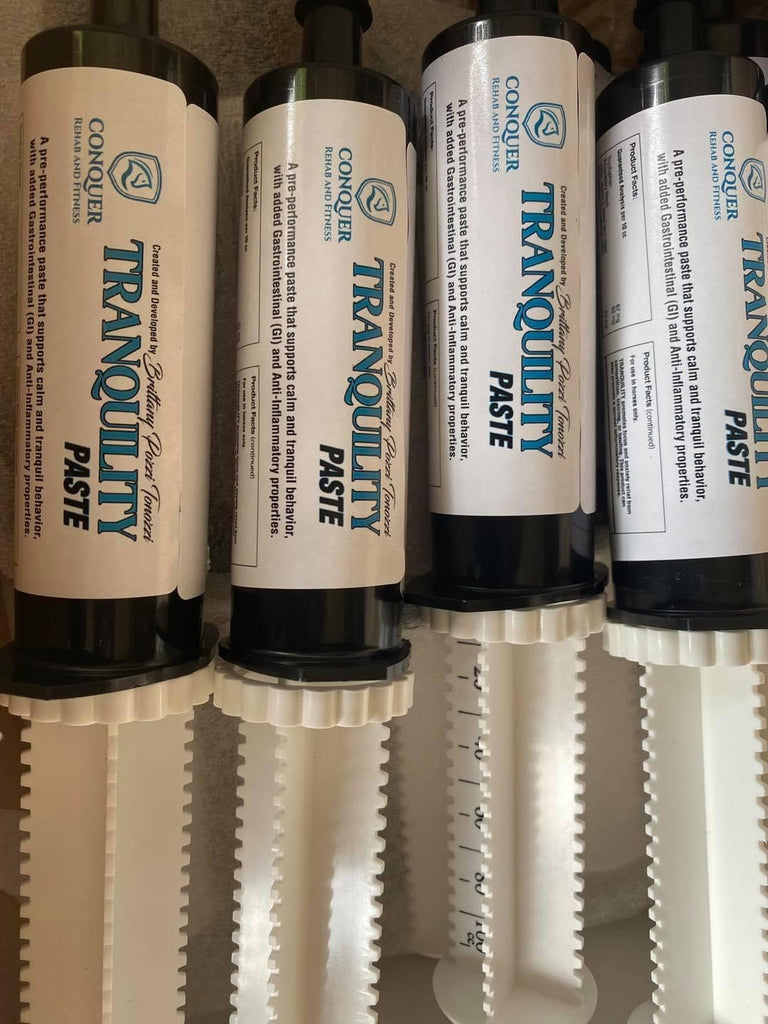 Tranquility Paste from Conquer Equine is a supplement that supports calm and tranquil behavior, with added gastrointestinal and anti-inflammatory properties.