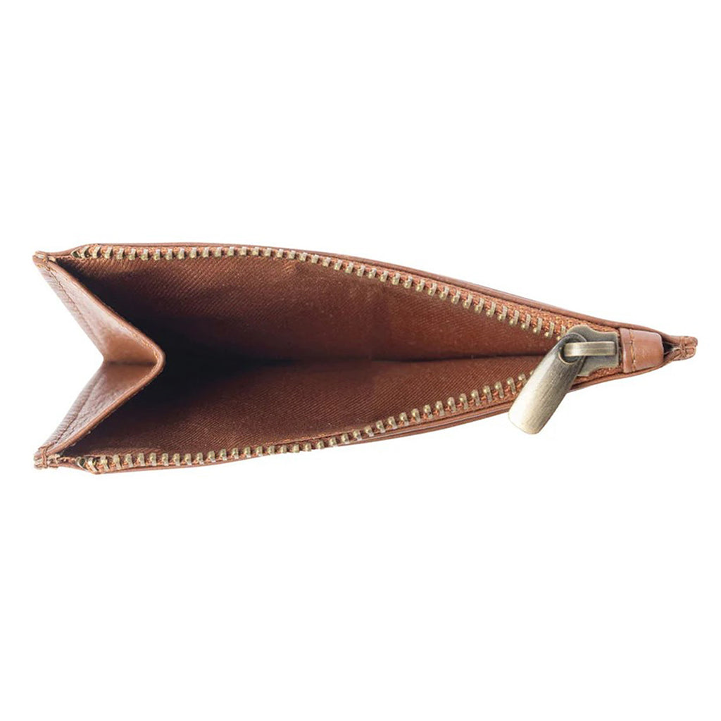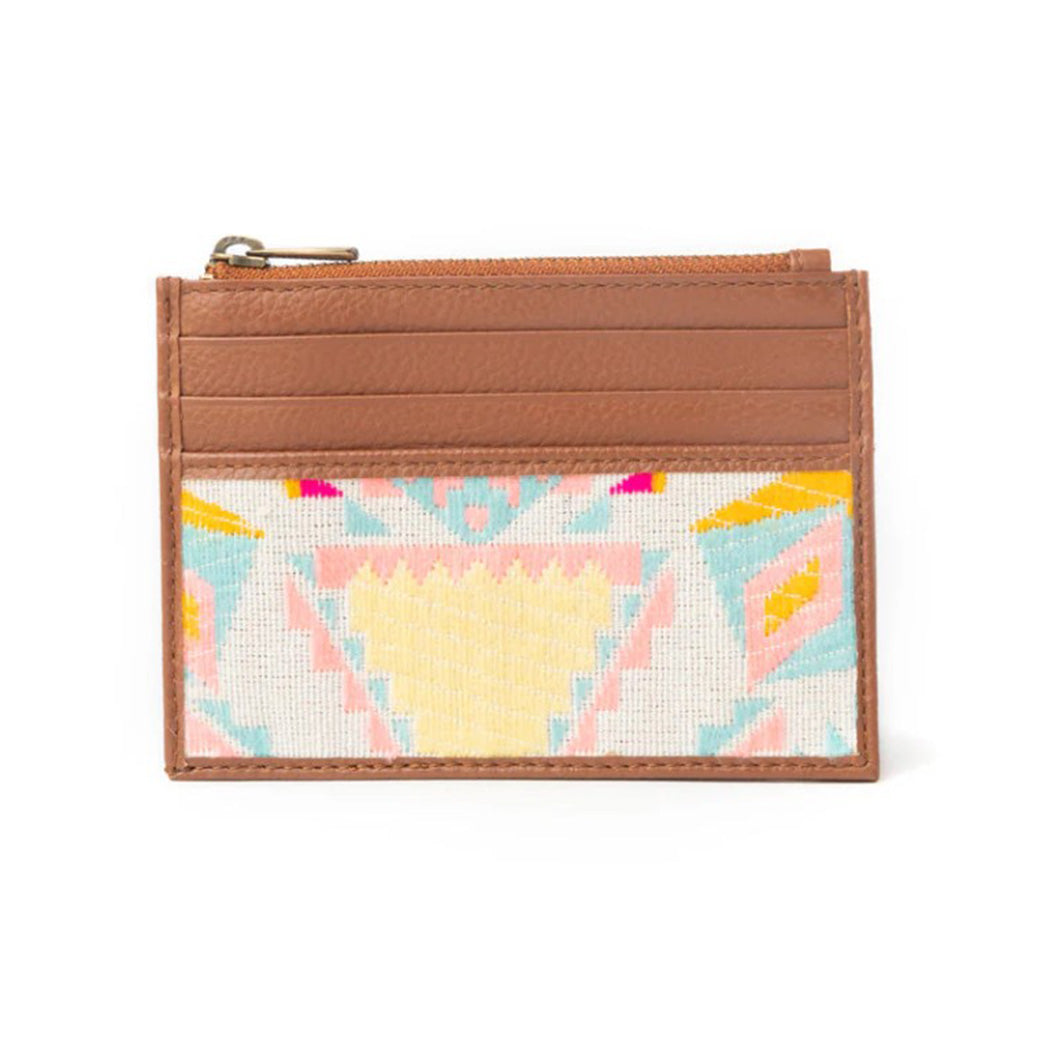 This trendy card holder boasts a compact size with plenty of card slots and top zippered pouch. The pebbled leather frame in brown is spiced up with a geometric print made from upcycled canvas in playful pastel hues like turquoise, pink, yellow, and mint. Plus, there are even extra card slots on the back! Perfect for keeping your must-haves close at hand while on the move.