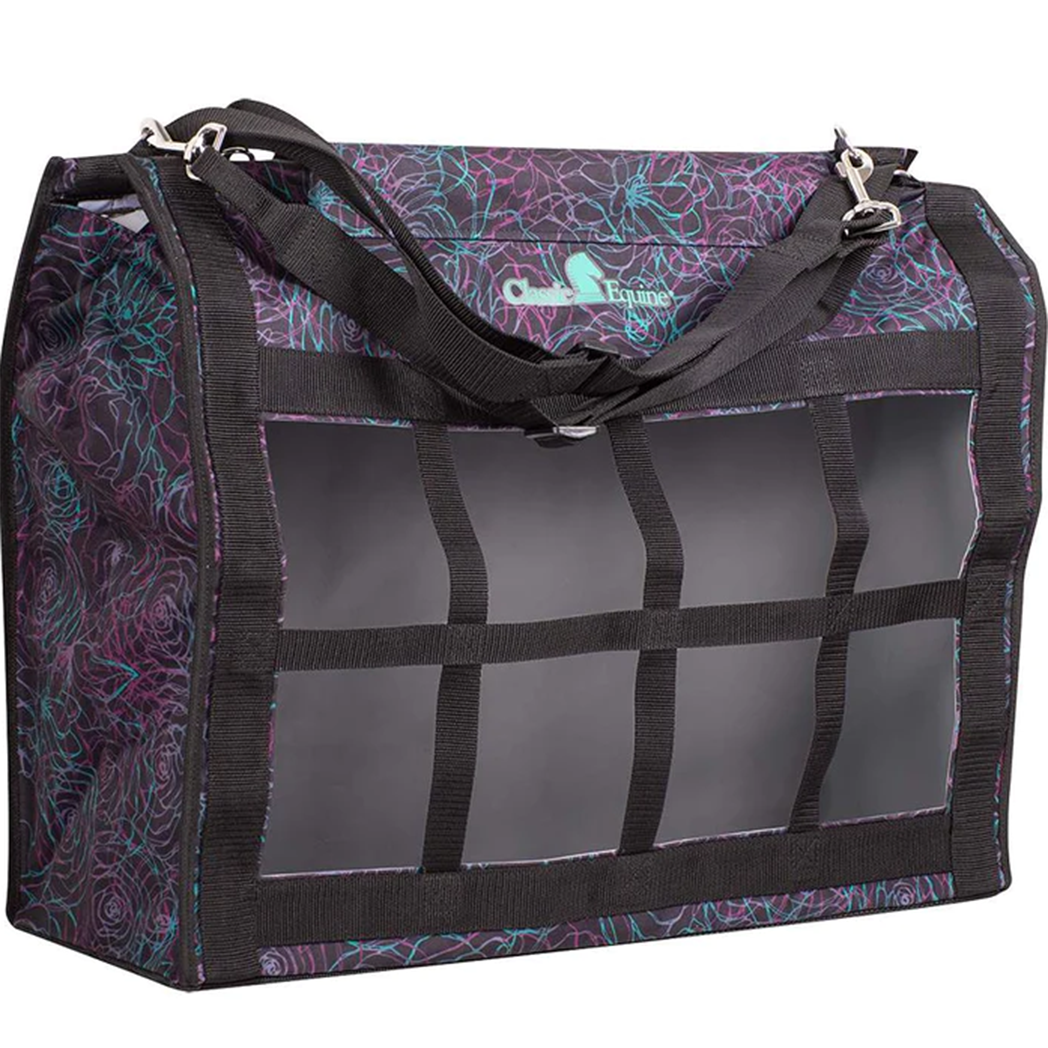 This topload hay bag from Classic Equine is durable and easy to use. The top flap Velcro's shut so hay can't be drug out of the top and instead must be pulled through the webbed squares in the front. This allows only small amounts of hay to be pulled through, therefore reducing waste. It has a long adjustable strap with a snap to make it easy to hang almost anywhere. This hay bag is made out of tough poly and it features a mesh bottom to allow dust and dirt to fall out.